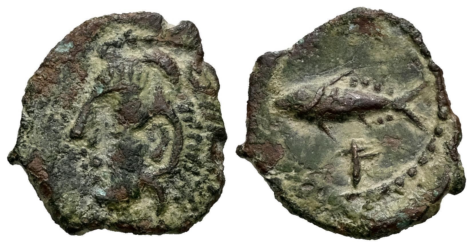 Gades-Gadir. 1/8 calco. 100-20 a.C. Cádiz. (Abh-No cita). (MIB-9/57). (Acip-695). Anv.: Cabeza de Hércules a izquierda, detrás clava. Rev.: Delfín a izquierda, debajo letra púnica alef. Ae. 1,12 g. Pátina algo saltada. Escasa. MBC-. Est...45,00.