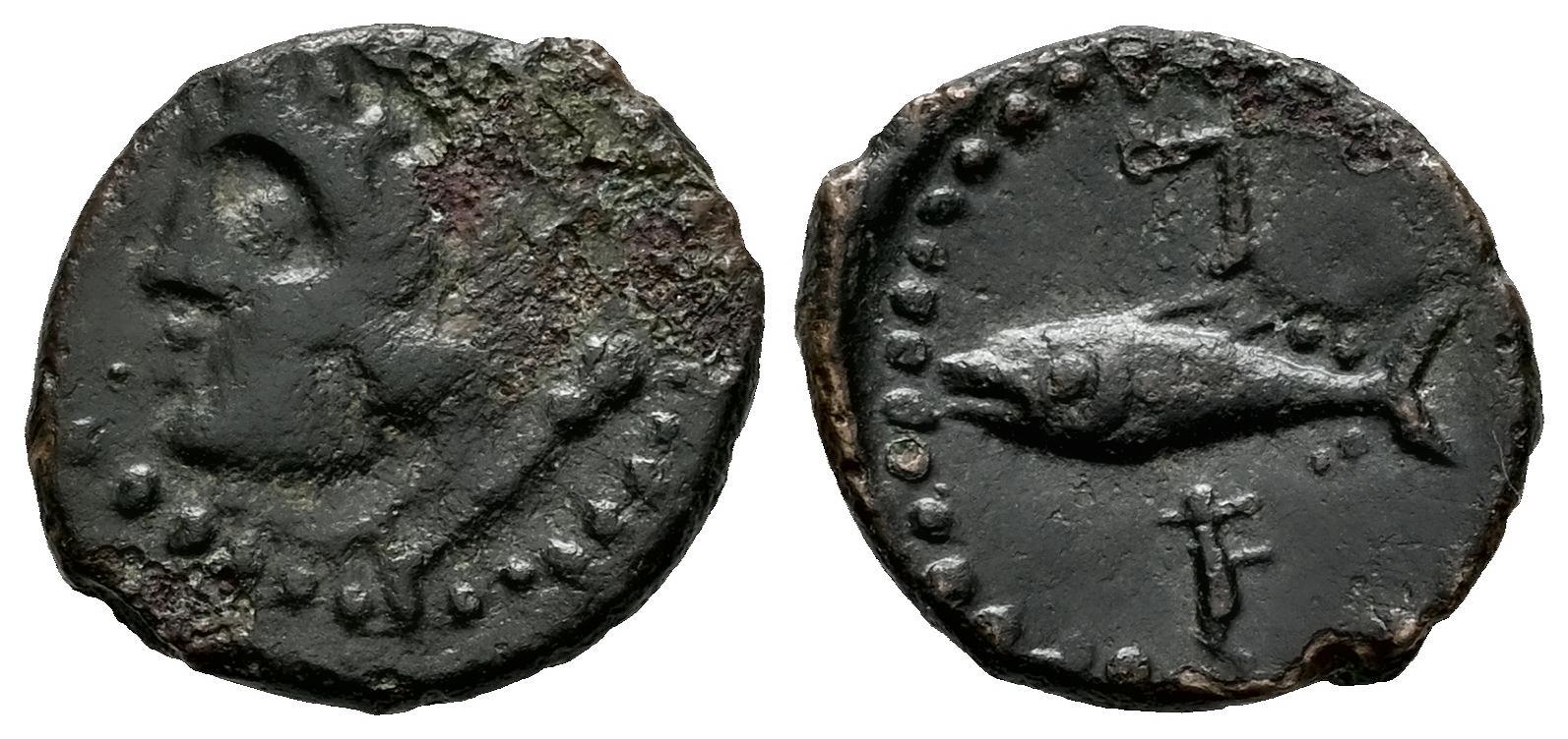 Gades-Gadir. 1/8 calco. 200-100 a.C. Cádiz. (Abh-No cita). (MIB-9/76a ID 61036, mismo ejemplar). (Acip-678). Anv.: Cabeza de Melkart a izquierda, con piel de león. Rev.: Atún a izquierda, encima y debajo letras púnicas mem y alef. Ae. 1,39 g. Escasa. Ex Áureo 48 (19/09/1994), lote 482. MIB 9/76a ID 61036, mismo ejemplar. MBC/EBC-. Est...75,00.