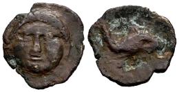 Gades-Gadir. 1/4 calco. 200-100 a.C. Cádiz. (Abh-1326). (MIB-9/42). (Acip-626). Anv.: Cabeza de frente de Melkart. Rev.: Delfín a derecha, leyenda encima y debajo. Ae. 1,31 g. Rara. BC+/BC. Est...30,00.