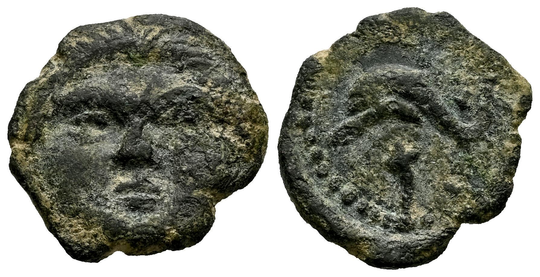 Gades-Gadir. 1/2 calco. 200-100 a.C. Cádiz. (Abh-1327). (MIB-9/39). (Acip-675). Anv.: Cabeza de frente. Rev.: Delfín a izquierda, letra fenicia alef debajo. Ae. 1,94 g. Muy rara. Muy pocos ejemplares conocidos. MBC-. Est...50,00.