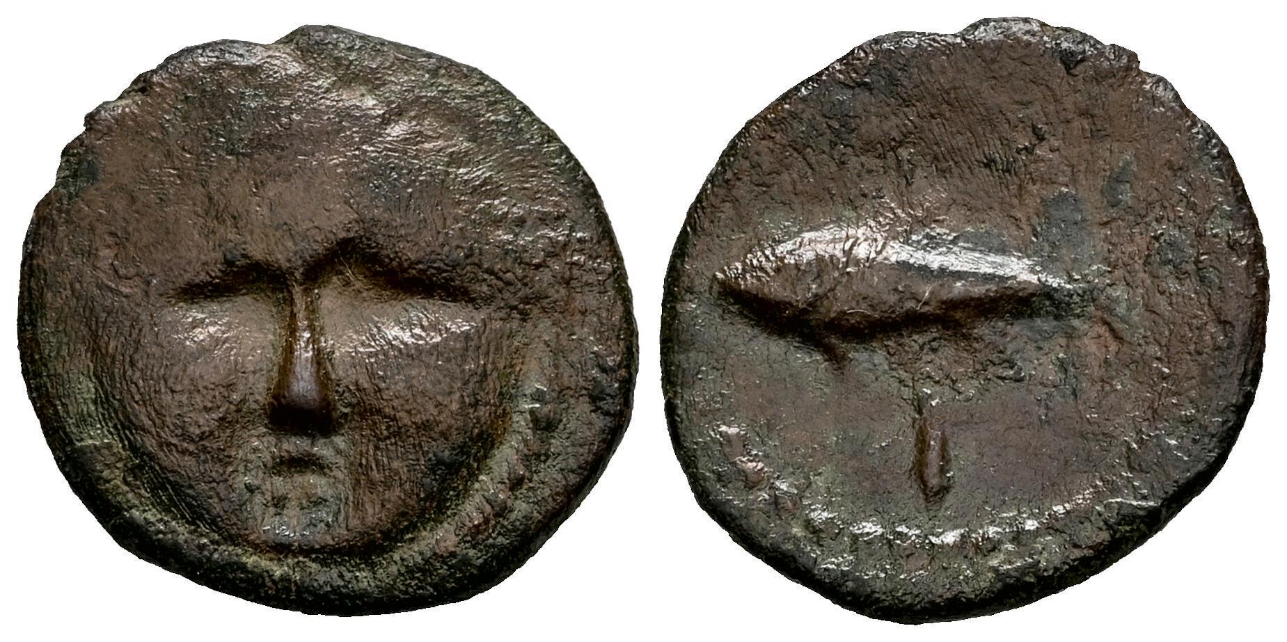 Gades-Gadir. 1/2 calco. 200-100 a.C. Cádiz. (Abh-1330). (MIB-9/38). (Acip-674). Anv.: Cabeza de frente. Rev.: Atún a izquierda debajo letra fenicia alef. Ae. 1,81 g. MBC-/BC+. Est...50,00.