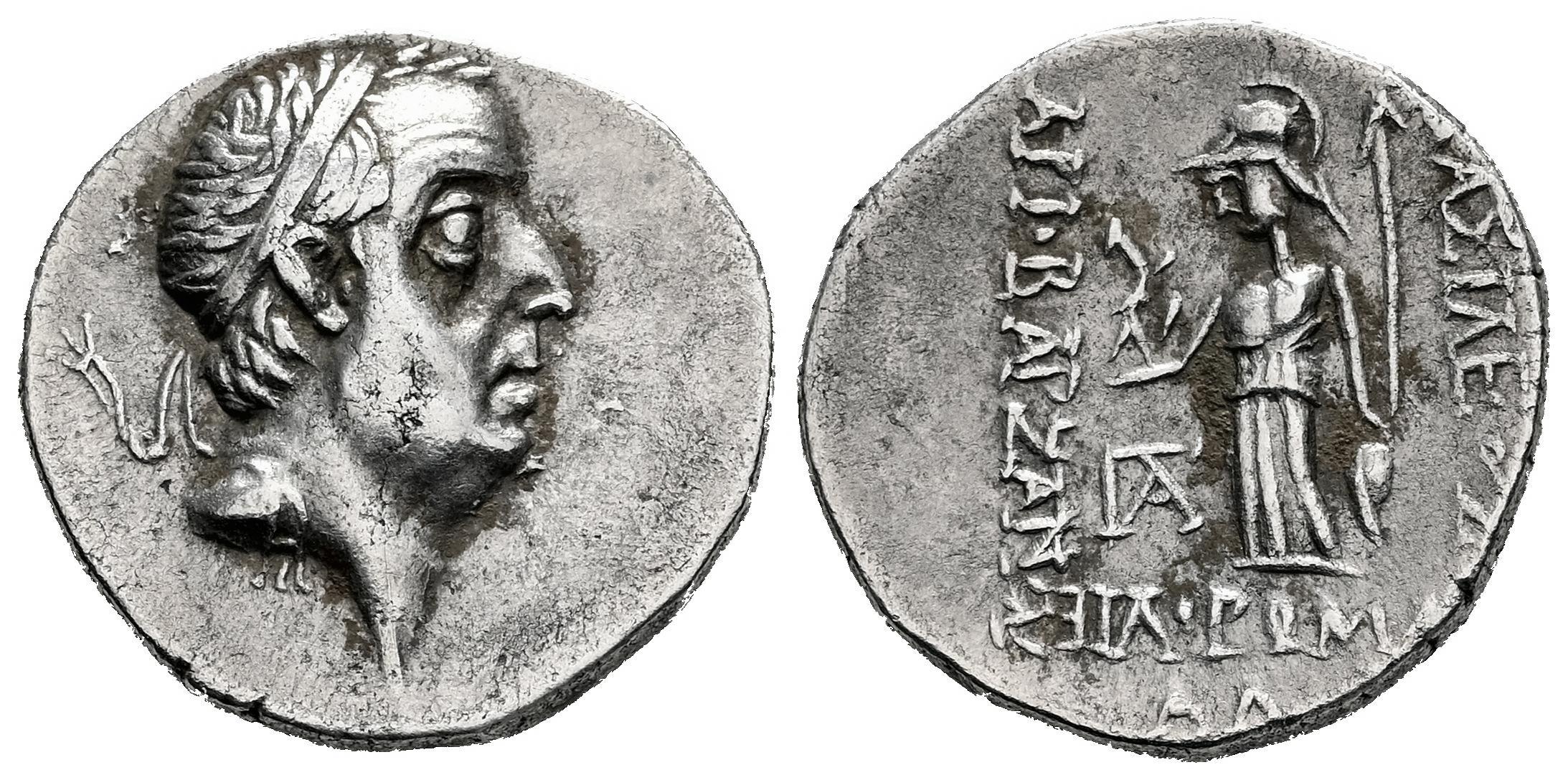 Reino Capadocia. Ariobarzanes I Philoromaios. Dracma. RY 30/31 = 67/68 a.C. Eusebia-Mazaka. (Hgc-7, 846). (Simonetta-44c). (DCA-460). Anv.: Cabeza con diadema a la derecha. Rev.: Atenea en pie a la izquierda, sosteniendo una Niké y una lanza, con la mano apoyada en un escudo a su lado; monograma en el interior izquierdo, Λ (fecha) en el exergo. Ag. 3,64 g. Ex Tauler & Fau 68 (03/11/2020), lote 1030. MBC+. Est...80,00.