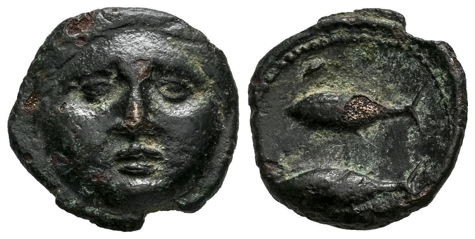 Gades-Gadir. 1/2 calco. 200-100 a.C. Cádiz. (Abh-1333). (MIB-9/22). (Acip-644). Anv.: Cabeza de frente. Rev.: Dos atunes a izquierda. Ae. 1,79 g. MBC+/MBC. Est...60,00.