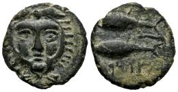 Gades-Gadir. Calco. 200-100 a.C. Cádiz. (Abh-1338). (MIB-9/35b). (Acip-656). Anv.: Cabeza de Melkart de frente con piel de león. Rev.: Dos atunes a izquierda, leyenda púnica. Ae. 3,05 g. MBC+/MBC-. Est...70,00.