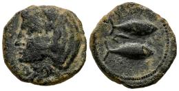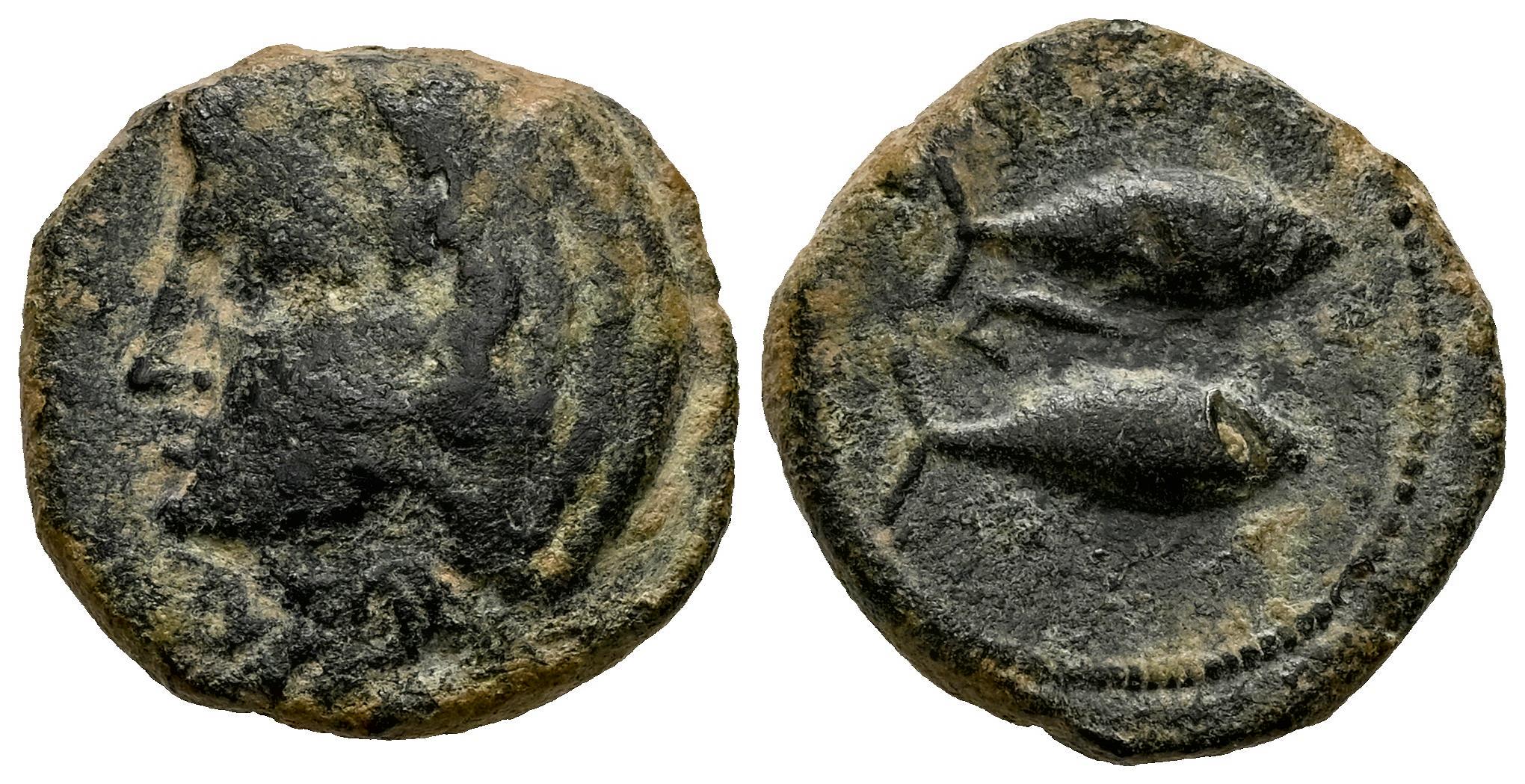 Gades-Gadir. Calco. 200-100 a.C. Cádiz. (Abh-No cita). (MIB-9/13). (Acip-639). Anv.: Cabeza de Melkart a izquierda, con piel de león. Rev.: Dos atunes a derecha y letra púnica beth entre ellos. Ae. 4,39 g. MBC-/MBC. Est...50,00.