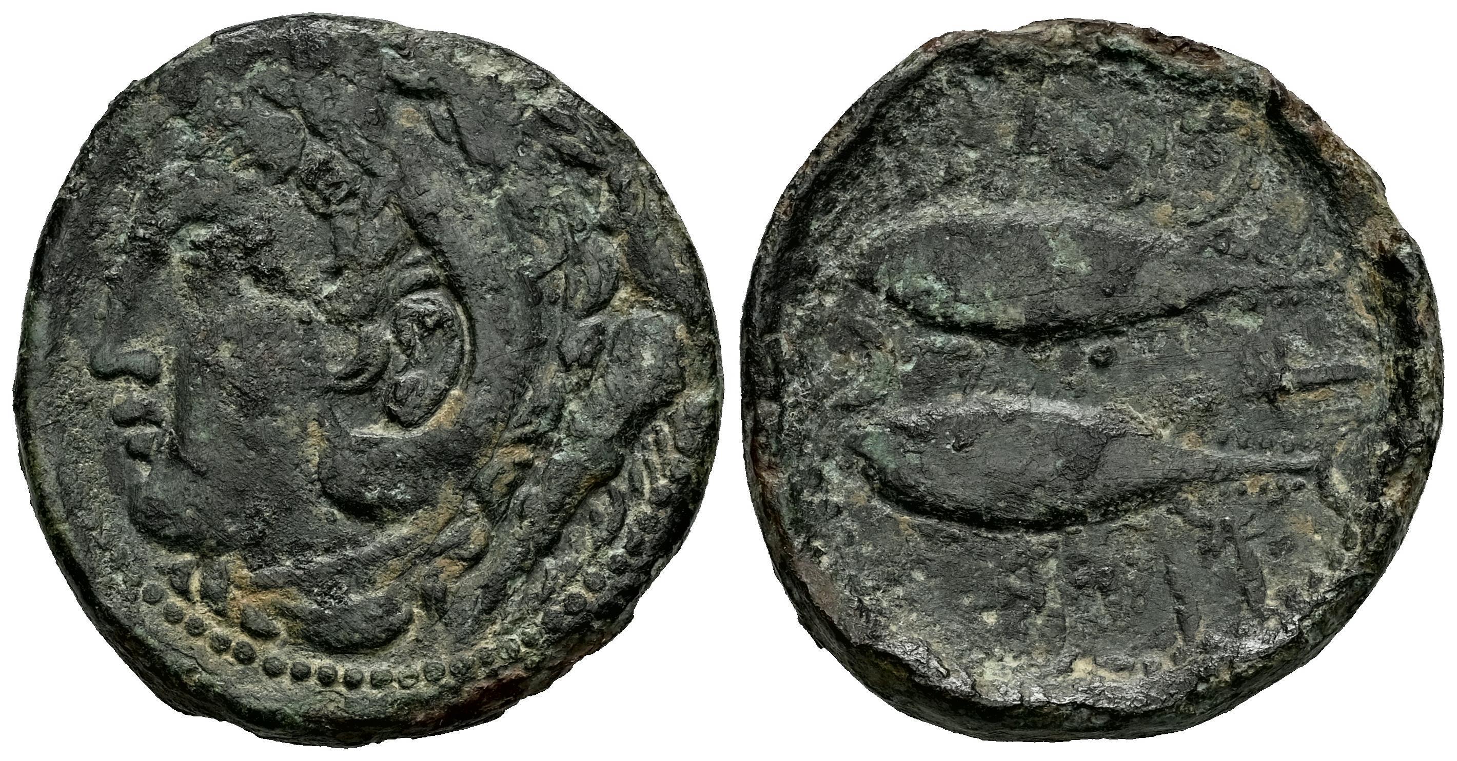 Gades-Gadir. As. 100-20 a.C. Cádiz. (Abh-1339). (Acip-665). Anv.: Cabeza de Hércules a izquierda, detrás clava. Rev.: Dos atunes a izquierda arriba y abajo, leyenda púnica, entre ambos creciente con punto y letra púnica alef. Ae. 10,94 g. Leves oxidaciones. MBC/MBC-. Est...50,00.