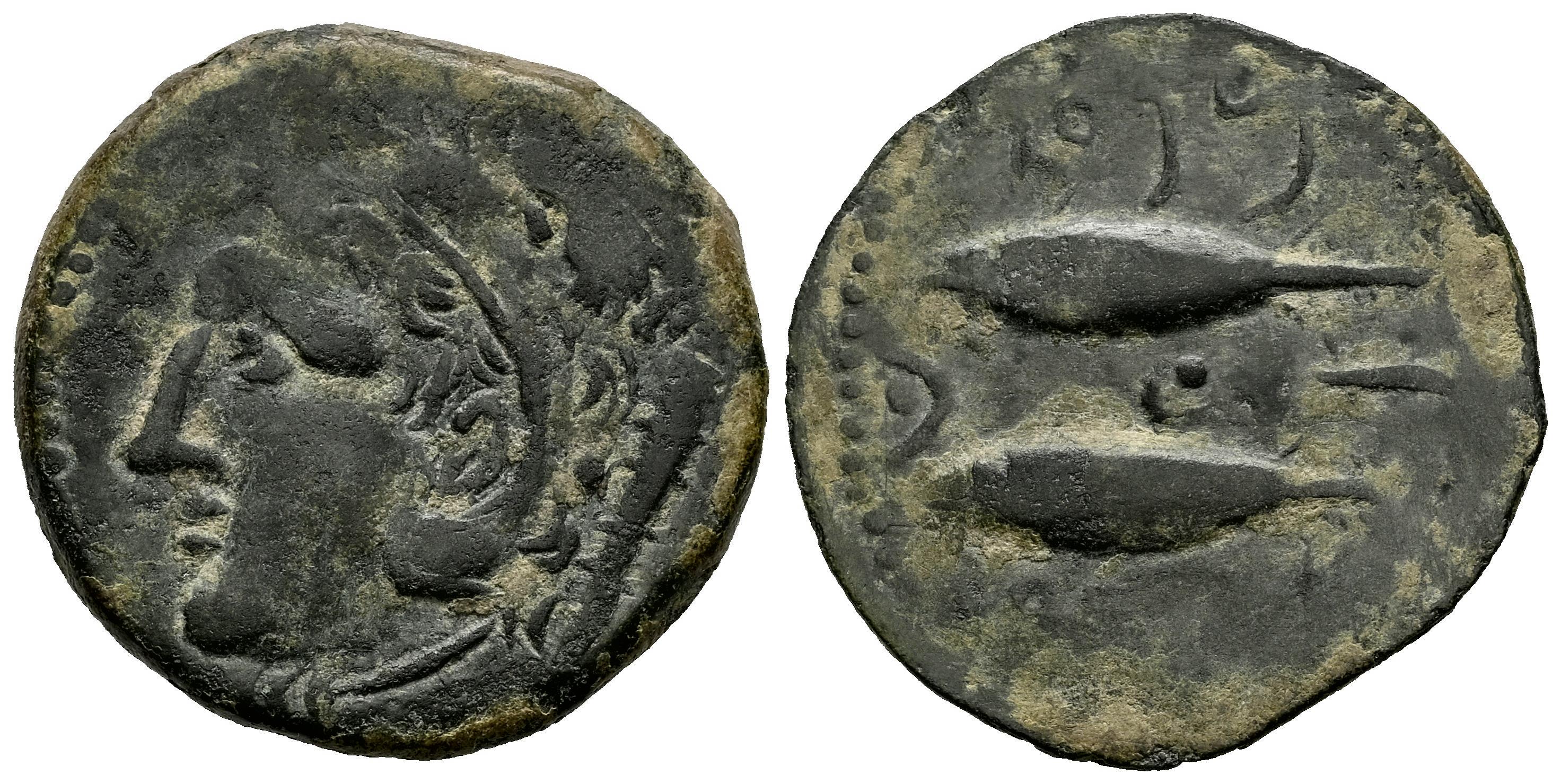 Gades-Gadir. As. 100-20 a.C. Cádiz. (Abh-1339). (Acip-665). Anv.: Cabeza de Hércules a izquierda, detrás clava. Rev.: Dos atunes a izquierda arriba y abajo, leyenda púnica, entre ambos creciente con punto y letra púnica alef. Ae. 7,04 g. MBC/MBC-. Est...50,00.
