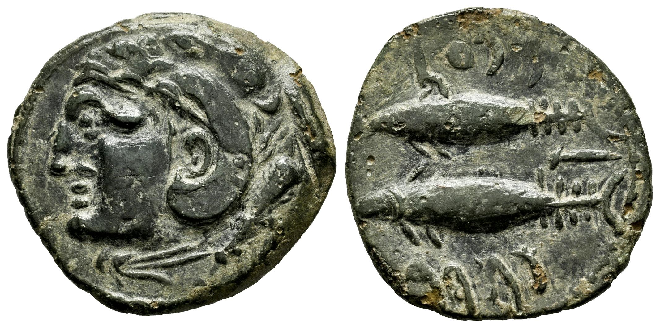 Gades-Gadir. As. 100-20 a.C. Cádiz. (Abh-1339 var.). (Acip-665 var.). Anv.: Cabeza de Hércules a izquierda, detrás clava. Rev.: Dos atunes a izquierda arriba y abajo, leyenda púnica, entre ambos letra púnica alef. Ae. 7,65 g. El ejemplar que ofrecemos no muestra el creciente con un punto delante de los atunes. No hemos hallado referencias sobre esta variante. Aparentemente, es inédito. MBC+. Est...150,00.