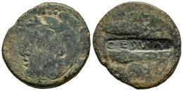 Gades-Gadir. As. 100-20 a.C. Cádiz. (Abh-1339). (MIB-441/92). (Tesorillo-Tipo 5/12). Anv.: Cabeza de Hércules a izquierda, detrás clava. Rev.: Dos atunes a izquierda arriba y abajo, leyenda púnica, entre ambos creciente con punto y letra púnica alef. Ae. 10,18 g. Contramarca en reverso CAESVLAM, así lo interpretan Sáez Bolaño y Blanco Villero en "Las monedas de la Bética Romana Vol.1 (1996)", anteriormente A. Delgado y Guadán interpretaron esta marca como INSVLAN (isla). Muy escasa. BC. Est...50,00.