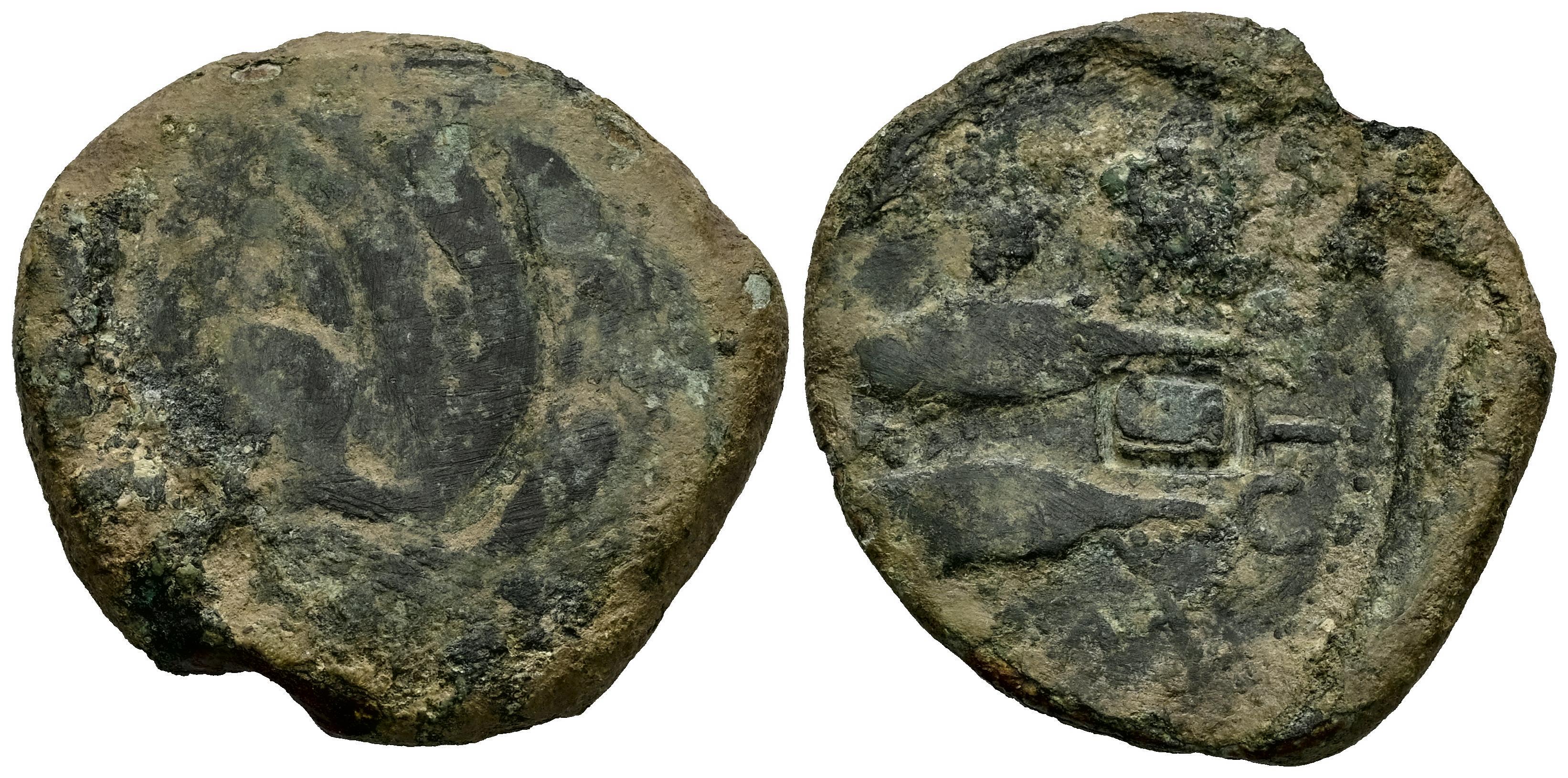 Gades-Gadir. As. 100-20 a.C. Cádiz. (Abh-1339). (MIB-453/33). (Tesorillo-Tipo 2/54). Anv.: Cabeza de Hércules a izquierda, detrás clava. Rev.: Dos atunes a izquierda arriba y abajo, leyenda púnica, entre ambos creciente con punto y letra púnica alef. Ae. 11,33 g. Contramarca rectangular en reverso. Escasa. BC-/BC. Est...60,00.