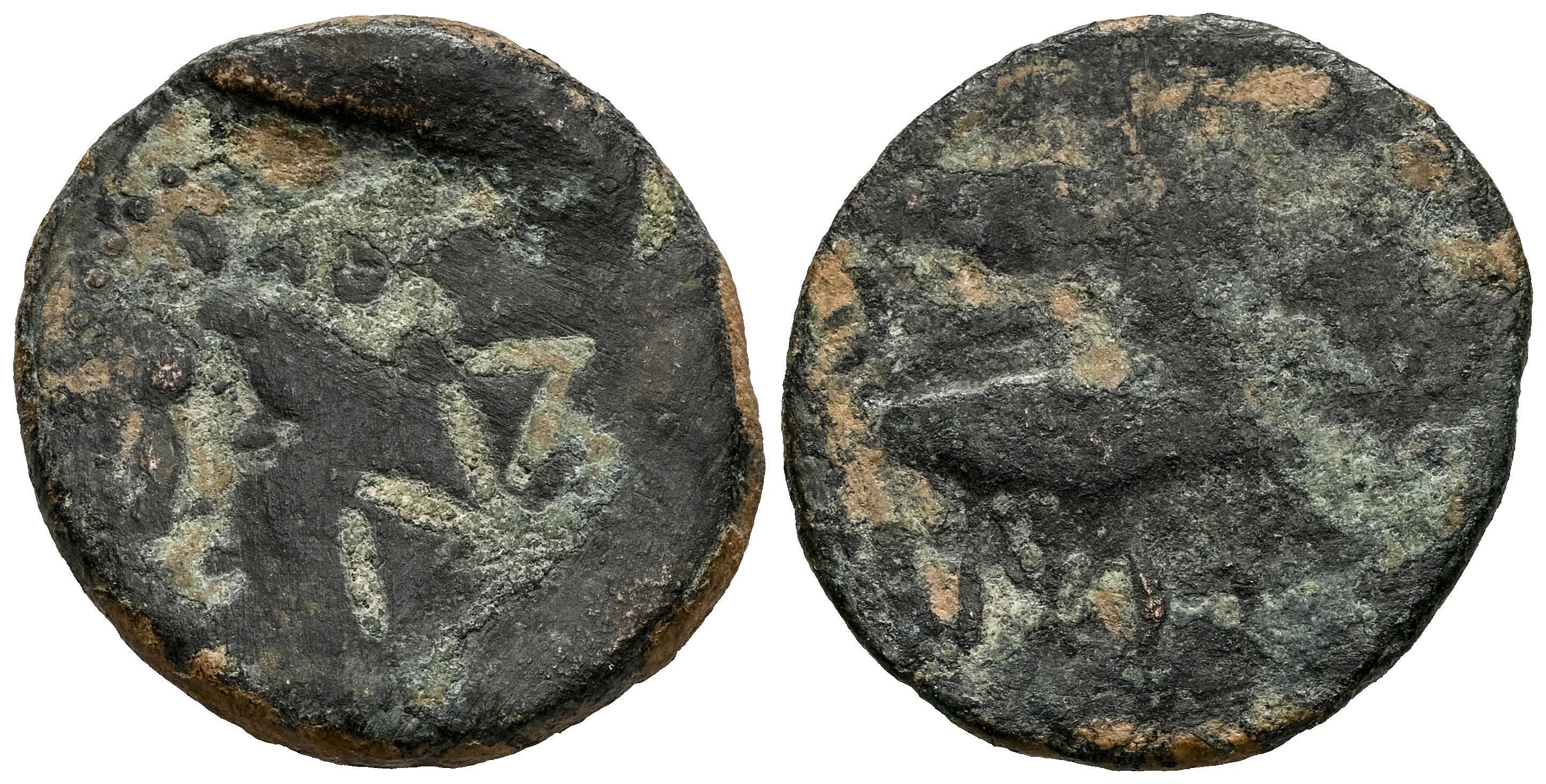 Gades-Gadir. As. 100-20 a.C. Cádiz. (Abh-1339). (MIB-446/96). (Tesorillo-Tipo 5/25). Anv.: Cabeza de Hércules a izquierda, detrás clava. Rev.: Dos atunes a izquierda arriba y abajo, leyenda púnica, entre ambos creciente con punto y letra púnica alef. Ae. 7,28 g. Contramarca ∧∆ incisa en anverso. Muy rara. BC-. Est...40,00.