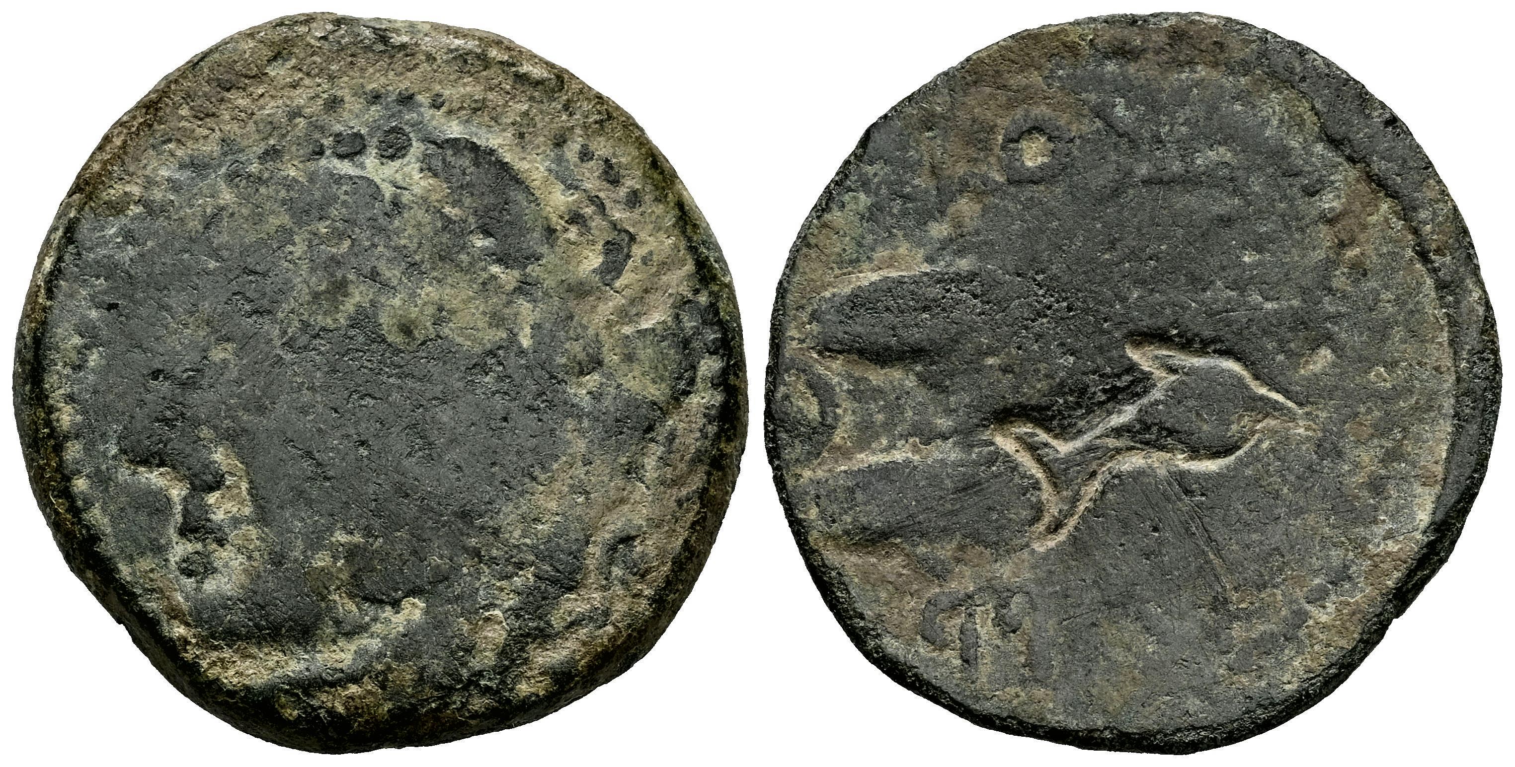Gades-Gadir. As. 100-20 a.C. Cádiz. (Abh-1339). (MIB-247/6a). (Tesorillo-Tipo 1/04a). Anv.: Cabeza de Hércules a izquierda, detrás clava. Rev.: Dos atunes a izquierda arriba y abajo, leyenda púnica, entre ambos creciente con punto y letra púnica alef. Ae. 8,93 g. Contramarca "Delfín" a la derecha sobre el reverso. Muy bien definida. BC+. Est...60,00.