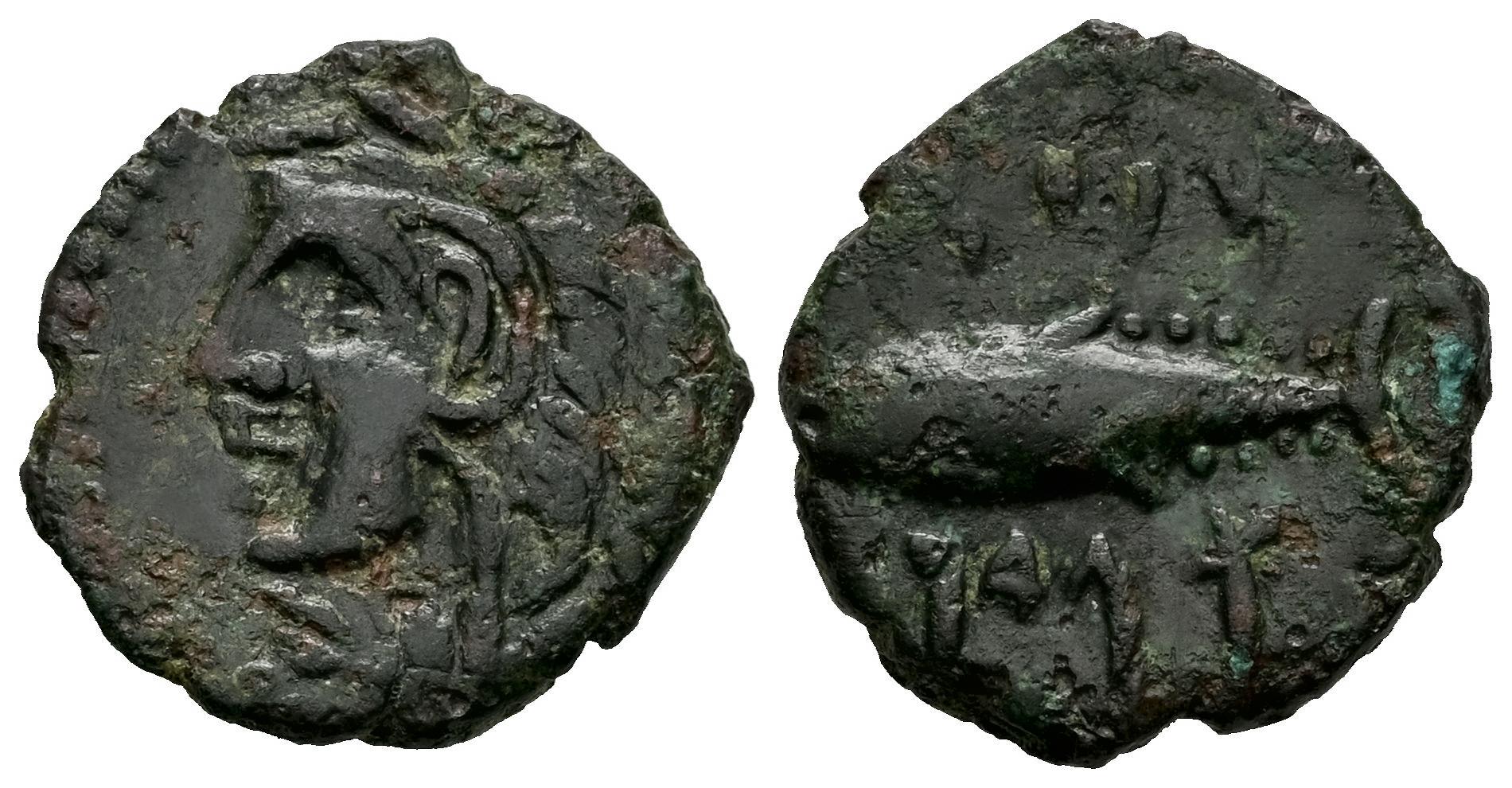 Gades-Gadir. 1/4 calco. 100-20 a.C. Cádiz. (Abh-1346 como Semis). (MIB-9/52a). (Acip-692). Anv.: Cabeza de Hércules a izquierda. Rev.: Atún a izquierda, encima y debajo leyenda púnica. Ae. 2,72 g. Rara. MBC. Est...60,00.