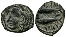 Gades-Gadir. Semis. 100-20 a.C. Cádiz. (Abh-1347). (MIB-9/47b). Anv.: Cabeza de Hércules a izquierda, delante clava. Rev.: Dos atunes a la izquierda, encima y debajo leyenda púnica, entre ambos creciente con punto y letra púnica alef. Ae. 4,79 g. MBC+. Est...60,00.