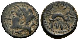 Gades-Gadir. Cuadrante. 100-20 a.C. Cádiz. (Abh-No cita). (MIB-9/75). (Acip-681/86). Anv.: Cabeza de Hércules a izquierda, detrás clava. Rev.: Delfín a izquierda, detrás tridente y encima y debajo leyenda púnica pʿlt - hgdr. Ae. 3,09 g. MBC. Est...70,00.