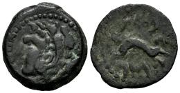 Gades-Gadir. Cuadrante. 100-20 a.C. Cádiz. (Abh-No cita). (MIB-9/75). (Acip-681/86). Anv.: Cabeza de Hércules a izquierda, detrás clava. Rev.: Delfín a izquierda, detrás tridente y encima y debajo leyenda púnica pʿlt - hgdr. Ae. 3,20 g. MBC-/BC+. Est...30,00.