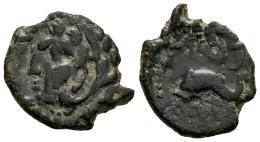 Gades-Gadir. Sextante. 100-20 a.C. Cádiz. (Abh-1357). (MIB-9/68b como 1/4 Calco). Anv.: Cabeza de Hércules a izquierda detrás clava. Rev.: Delfín a izquierda, encima y debajo leyenda púnica. Ae. 1,88 g. MBC+/MBC. Est...35,00.