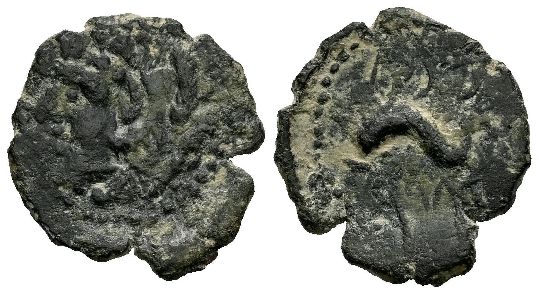 Gades-Gadir. Sextante. 100-20 a.C. Cádiz. (Abh-1357). (MIB-9/68b como 1/4 Calco). Anv.: Cabeza de Hércules a izquierda detrás clava. Rev.: Delfín a izquierda, encima y debajo leyenda púnica. Ae. 1,27 g. MBC. Est...35,00.