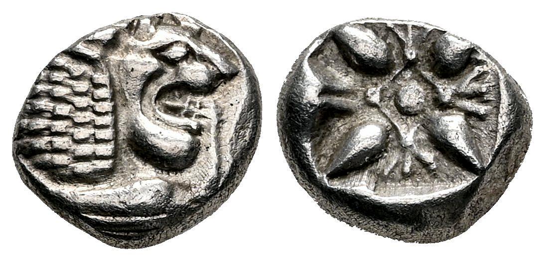 Ionia. Miletos. Dióbolo. 520-450 a.C. (SNG Kayhan-462/75). (Sng Cop-948). Anv.: Parte delantera de un león rugiente a la izquierda, con la cabeza invertida. Rev.: Patrón estrellado dentro de un cuadrado incuso. Ag. 1,16 g. Ex Tauler & Fau 69 (10/11/2020), lote 2009. EBC-. Est...75,00.