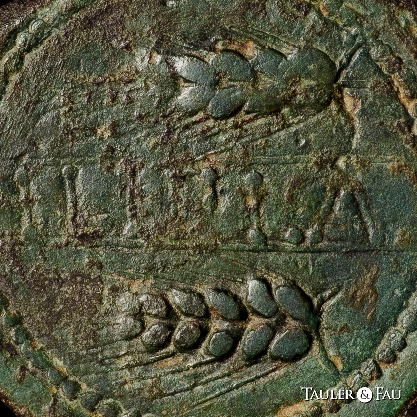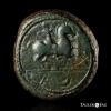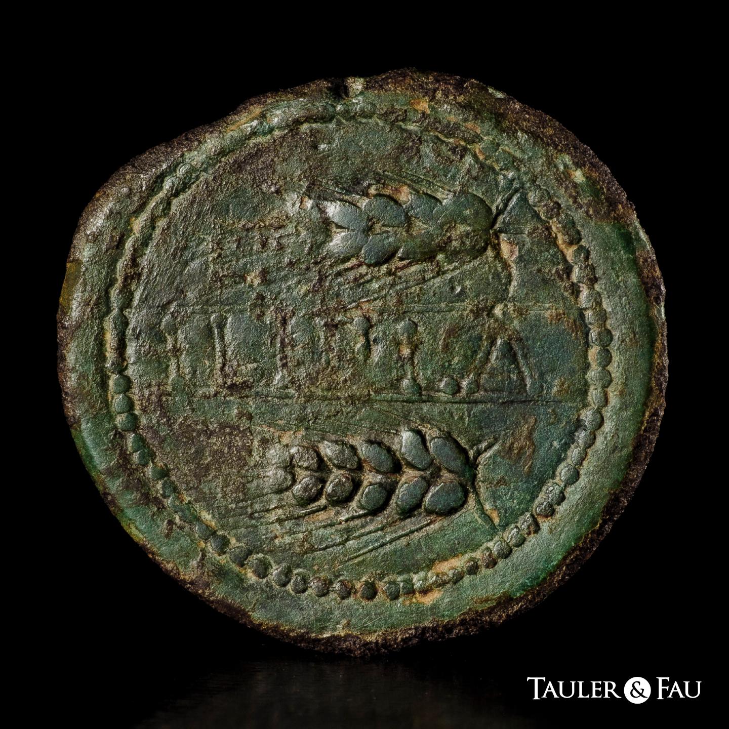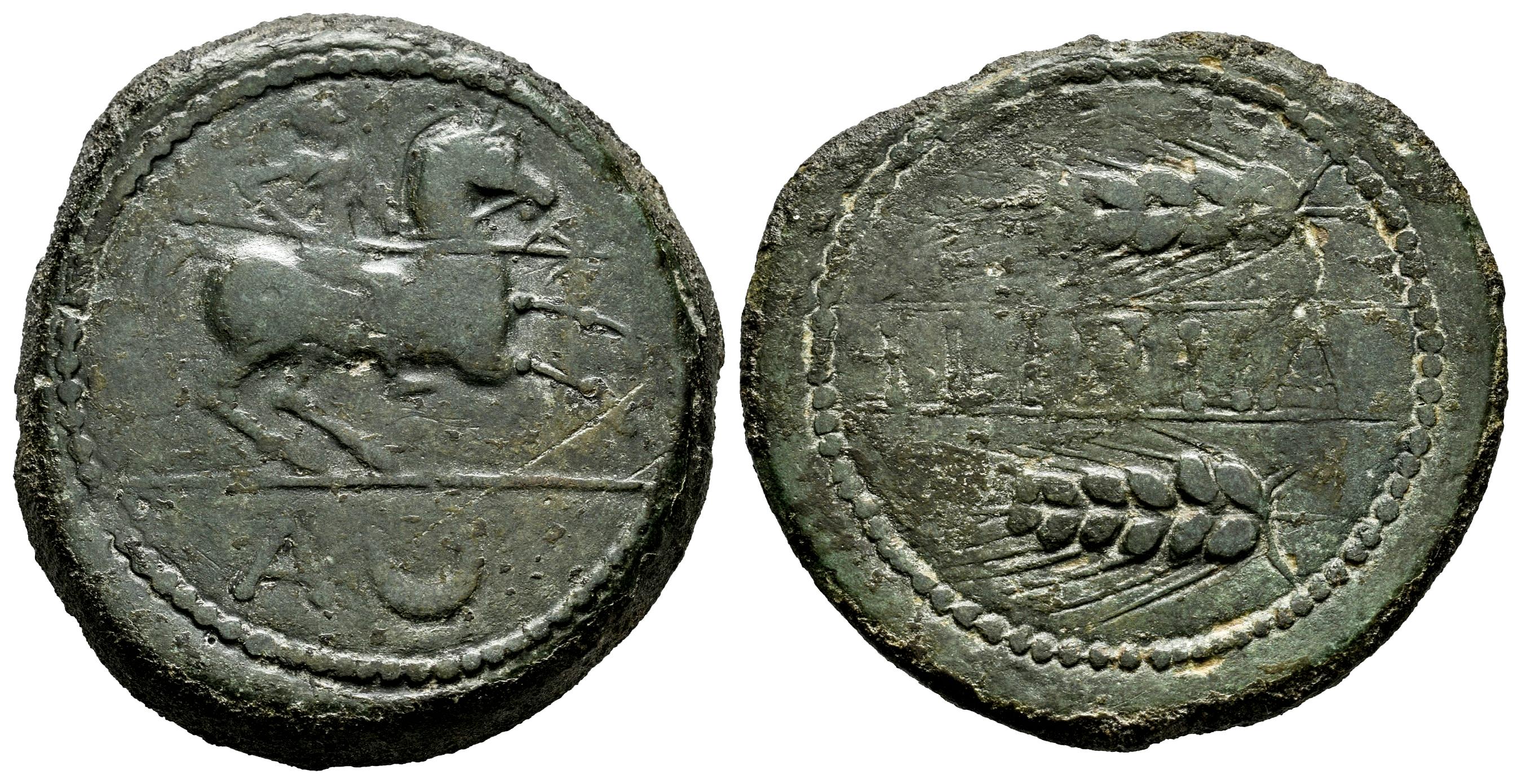 Ilipla. As. 50 a.C. Niebla (Huelva). (Abh-1556). (MIB-176/1). (Acip-2370). Anv.: Jinete con lanza a derecha, debajo A y creciente. Rev.: Leyenda ILIPLA entre líneas y dos espigas a izquierda. Ae. 23,30 g. Acuñación bien centrada. Pátina verde. Escasa. MBC-. Est...300,00.