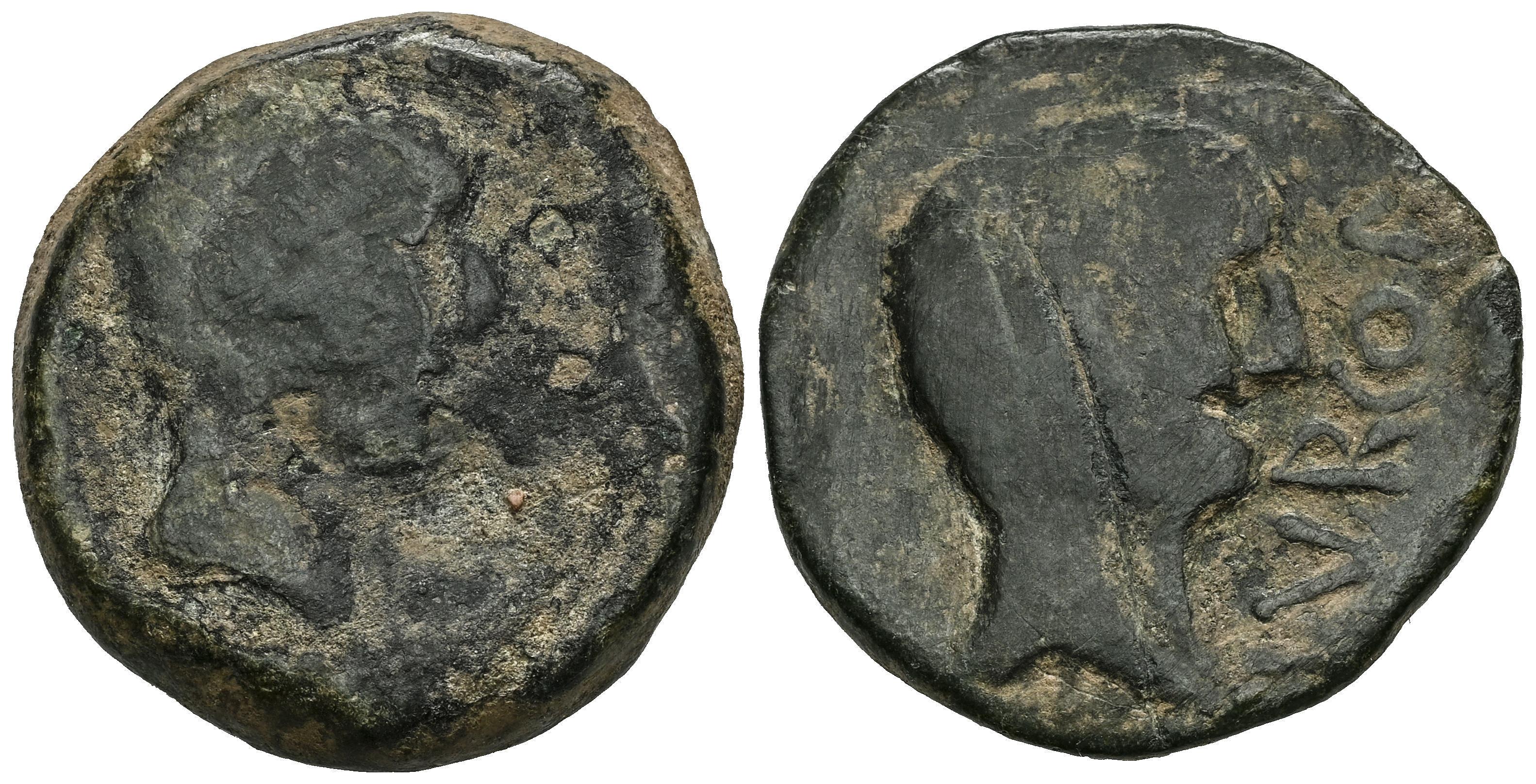 Ilurco. As. 50 a.C. Pinos Puente (Granada). (Abh-1566). (MIB-212/1). (Acip-2315). Anv.: Cabeza masculina a derecha. Rev.: Cabeza masculina a derecha, delante (I)LVRCON. Ae. 17,26 g. Conservación habitual para esta ceca. Rayas en reverso. Rara. BC/BC+. Est...90,00.
