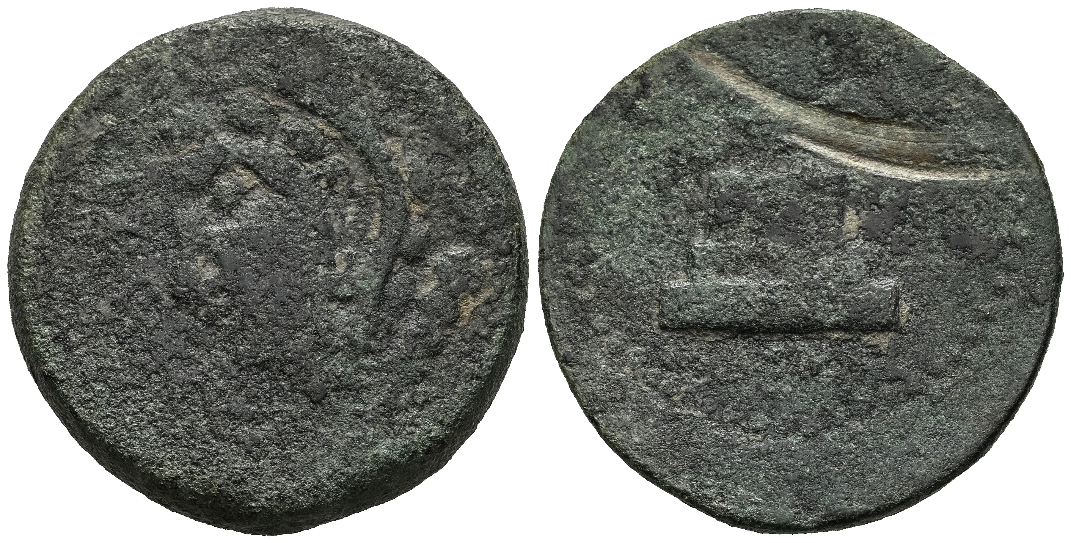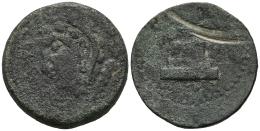 Lascuta. As. 150-50 a.C. Alcalá de los Gazules (Cádiz). (Abh-1665). (MIB-18/01). (Acip-940). Anv.: Cabeza de Melkart a izquierda, delante LASCVT. Rev.: Ara con tres palmas, debajo leyenda Libio-fenicia. Ae. 19,65 g. Raya en reverso. Muy rara. BC-. Est...100,00.