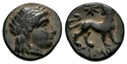 Ionia. Miletos. AE 11. 175-85 a.C. Magistrado Simos. Anv.: Cabeza laureada de Apolo a la derecha. Rev.: León en pie a la derecha, cabeza invertida; estrella arriba, ΣΙΜΟΣ abajo. Ae. 1,04 g. Rara. MBC/MBC+. Est...50,00.