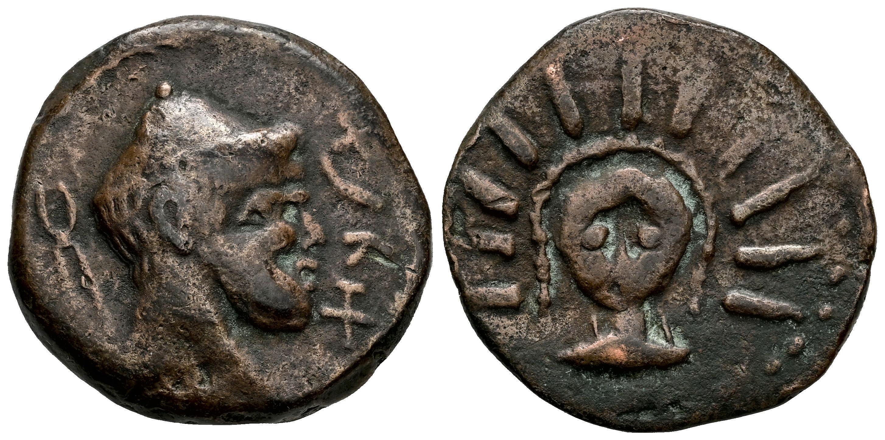 Malaka. As. 200-20 a.C. Málaga. (Abh-1726 var.). (MIB-10/14b). Anv.: Cabeza de Vulcano a derecha, detrás tenazas, delante leyenda púnica. Rev.: Cabeza de frente de Helios. Ae. 9,38 g. Muy escasa. MBC-. Est...90,00.