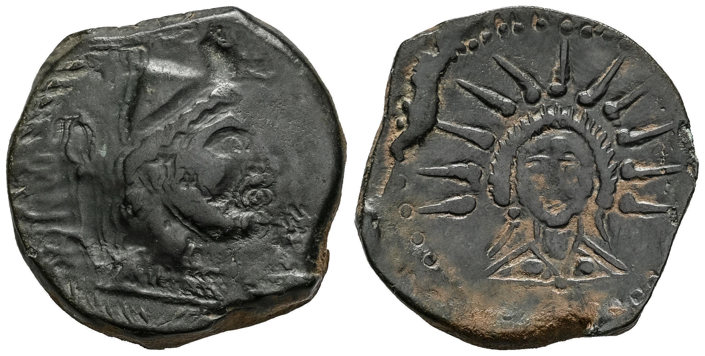 Malaka. As. 200-20 a.C. Málaga. (Abh-1727). (MIB-10/16a). (Acip-786 var.). Anv.: Cabeza de Vulcano a derecha, detrás tenazas y leyenda púnica. Rev.: Cabeza de frente de Helios. Ae. 10,33 g.  Doble acuñación en anverso. MBC-/MBC. Est...100,00.