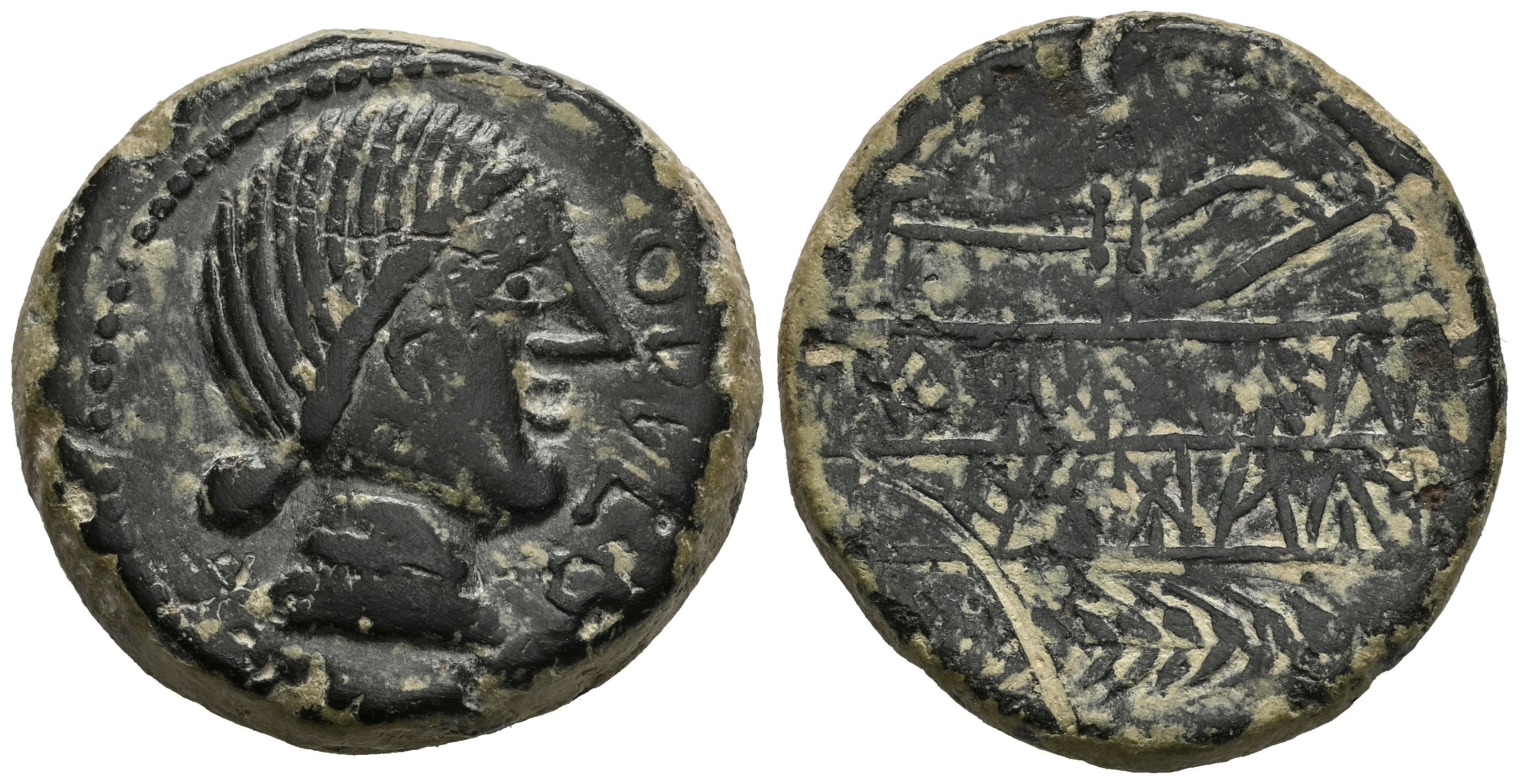 Obulco. As. 220-20 a.C. Porcuna (Jaén). (Abh-1785). (MIB-159/11b). (Acip-2215). Anv.: Cabeza femenina a derecha, delante OBVLOO. Rev.: Arado a izquierda, debajo espiga, entre ambos leyenda ibérica a izquierda invertida UIUIBORTUN/MUABOI. Ae. 19,79 g. Raya en reverso. MBC. Est...70,00.