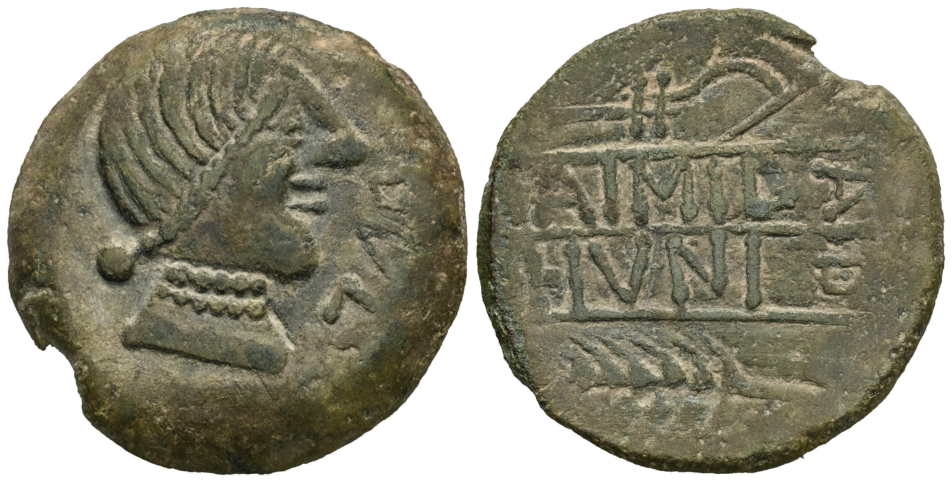 Obulco. As. 220-20 a.C. Porcuna (Jaén). (Abh-1807). (MIB-159/26a). (Acip-2222). Anv.: Cabeza femenina a derecha, delante OBVLCO. Rev.: Arriba arado a derecha, debajo espiga a izquierda, en medio leyenda L. AIMIL/M. IVNI/AID. Ae. 13,14 g. MBC/MBC-. Est...70,00.