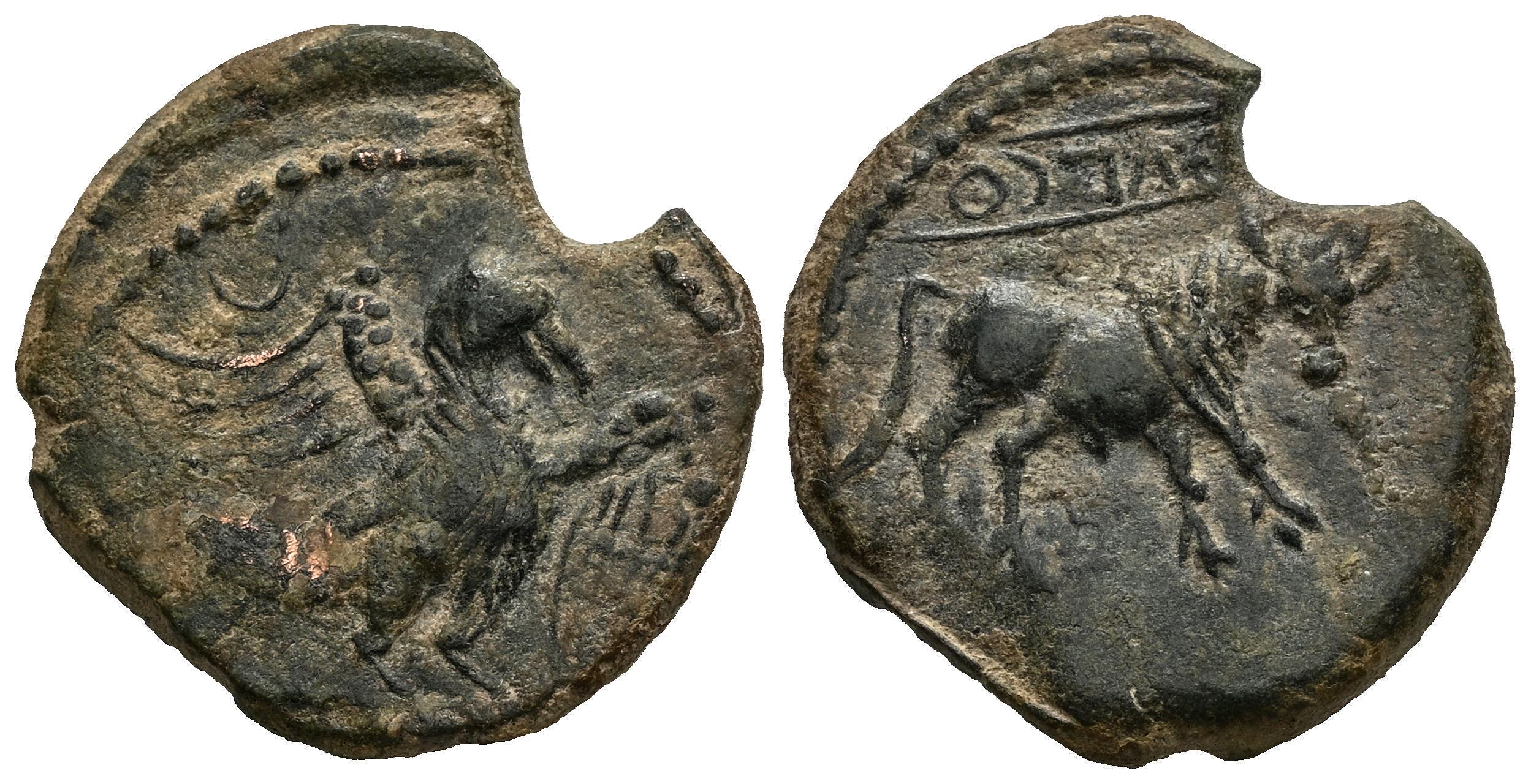 Obulco. Semis. 220-20 a.C. Porcuna (Jaén). (Abh-1849). (MIB-159/15d). (Acip-2242). Anv.: Águila a derecha, creciente encima. Rev.: Toro a derecha, encima de derecha a izquierda y al revés OBVLCO entre dos líneas. Ae. 5,75 g. Cospel irregular. MBC/MBC+. Est...100,00.