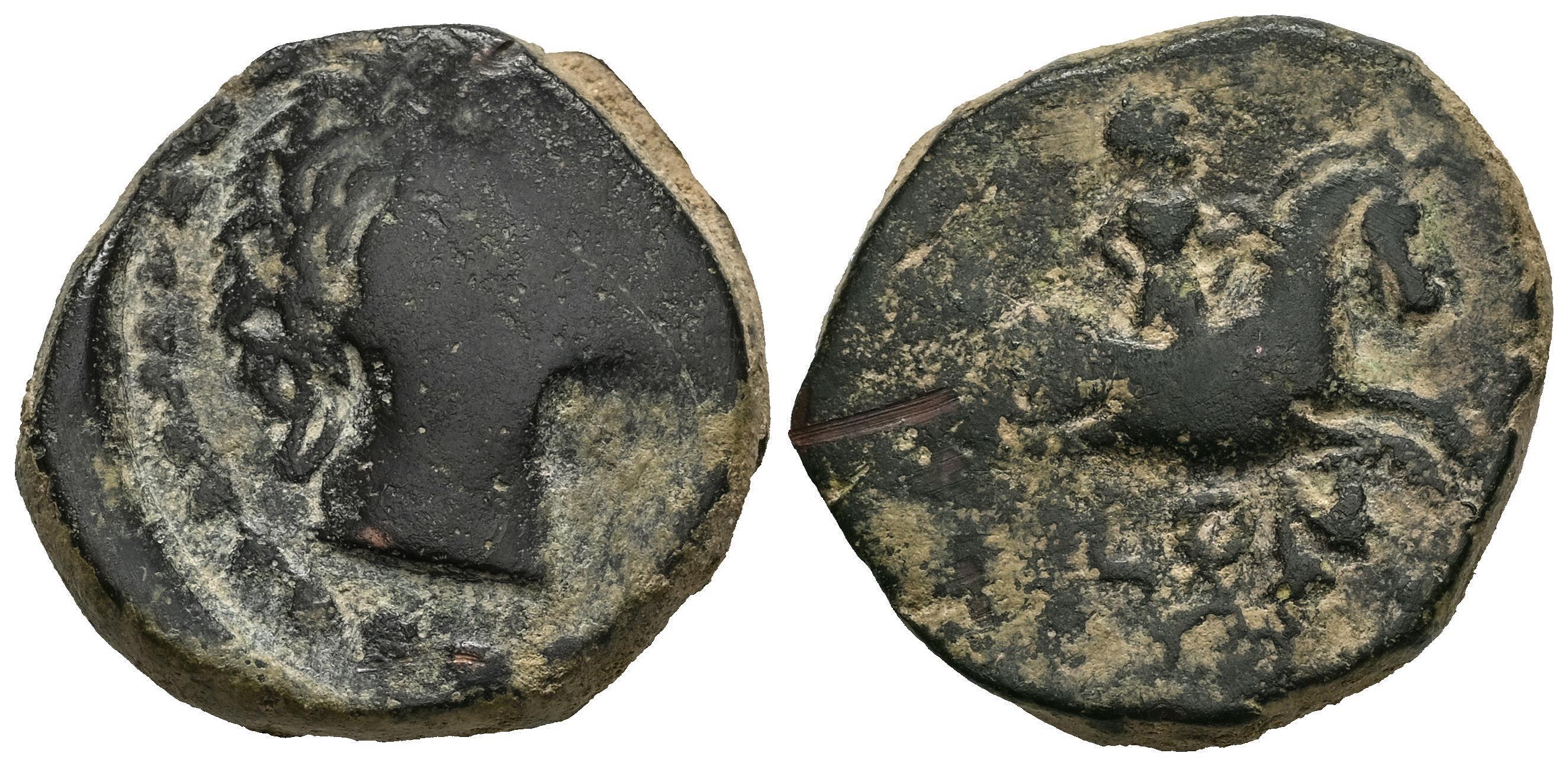 Olontigi. As. 50-20 a.C. Aznalcázar (Sevilla). (Abh-1876). (MIB-24/11b). Anv.: Cabeza masculina a derecha. Rev.: Jinete a derecha, debajo OLONT. Ae. 11,27 g. Vano de acuñación. Rara. BC+/MBC-. Est...90,00.