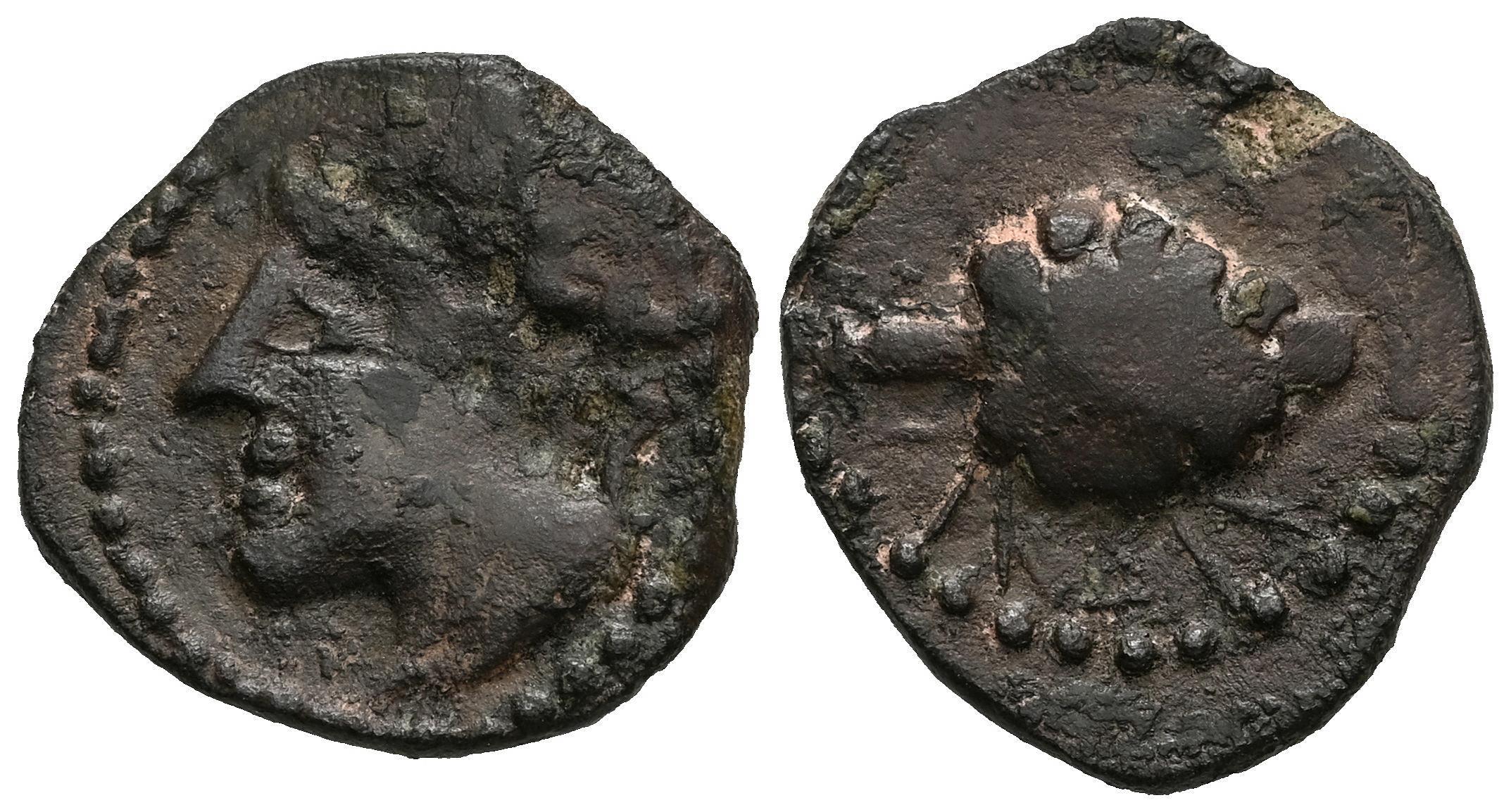 Olontigi. Semis. 50-20 a.C. Aznalcázar (Sevilla). (Abh-1879). (MIB-24/04). (Acip-855). Anv.: Cabeza masculina a izquierda. Rev.: Piña a derecha, debajo leyenda Púnica. Ae. 3,54 g. Rara. MBC-. Est...100,00.