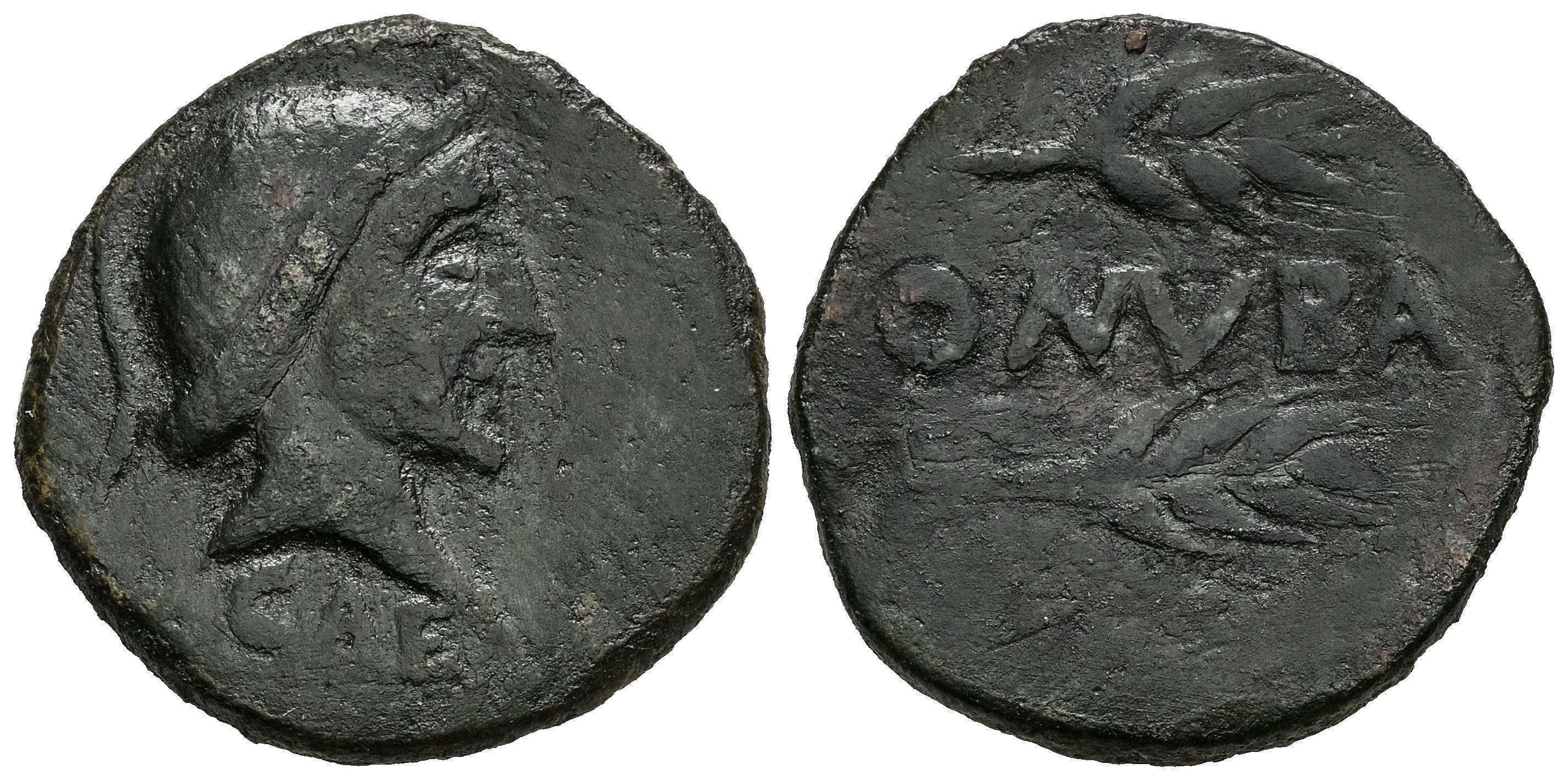 Onuba. As. 50 a.C. Huelva. (Abh-1893). (MIB-175/6). (Acip-2417). Anv.: Cabeza masculina con casco a derecha, alrededor leyenda C.AE(LI. Q. PVBLILI). Rev.: Dos espigas a derecha, entre ambas ONVBA. Ae. 8,19 g. Campos ligeramente repasados. Muy escasa. MBC-. Est...150,00.