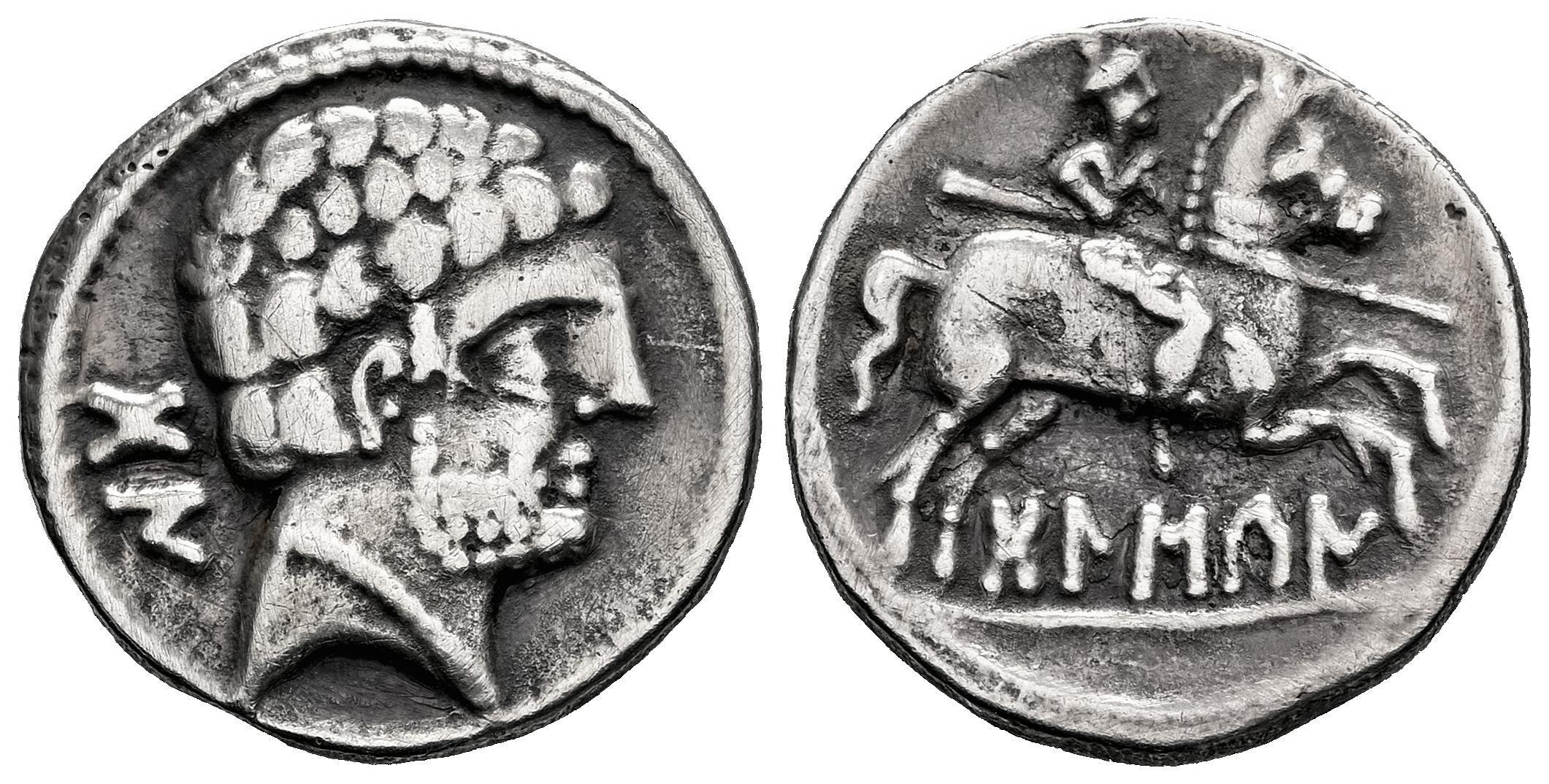 Bolskan. Denario. 180-20 a.C. Huesca. (Abh-1911). (MIR-79/07a). Anv.: Cabeza barbada a derecha, detrás letras ibéricas BON. Rev.: Jinete con lanza a derecha, debajo leyenda ibérica BOLSKAN. Ag. 3,77 g. Limpiada. Ex Tauler & Fau 63 (14/07/2020), lote 3068. MBC. Est...100,00.