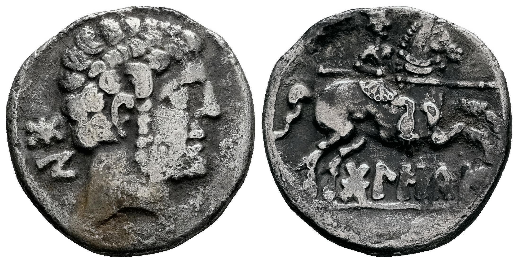 Bolskan. Denario. 180-20 a.C. Huesca. (Abh-1911). (Acip-1417). Anv.: Cabeza barbada a derecha, detrás letras ibéricas BON. Rev.: Jinete con lanza a derecha, debajo leyenda ibérica BOLSKAN. Ag. 3,74 g. MBC-. Est...75,00.
