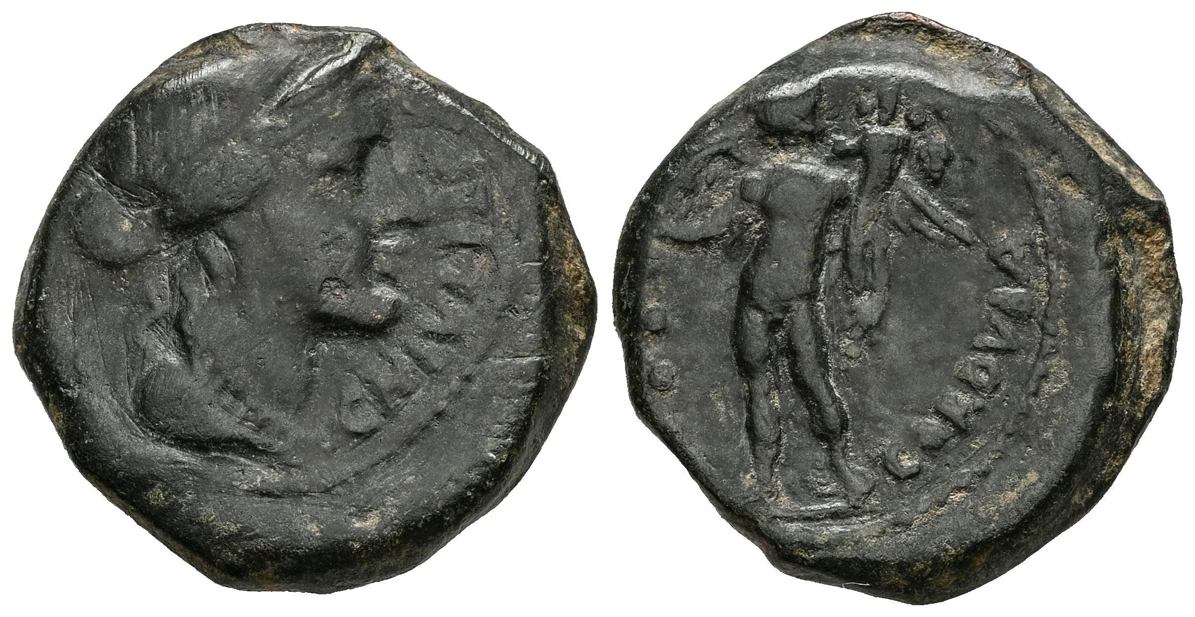 Corduba. Semis. 50 a.C. Córdoba. (Abh-1980 var.). (MIB-174/04). (Acip-2484). Anv.: Cabeza de Venus a derecha, delante CN. IVLI. L.F.Q., detrás tres puntos. Rev.: Cupido con cornucopia y antorcha a izquierda, a derecha CORDVBA, a izquierda, tres puntos. Ae. 8,55 g. MBC-. Est...45,00.