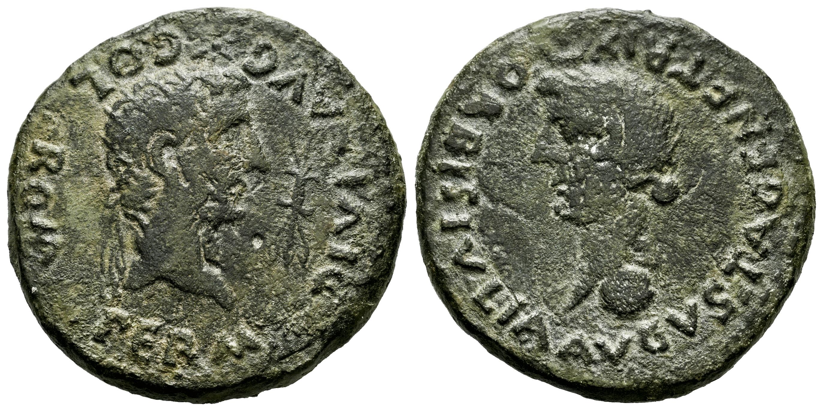 Colonia Rómula. Época de Tiberio. Dupondio. 14-36 d.C. Sevilla. (Abh-2014). (Acip-3360). Anv.: Cabeza radiada de Augusto a derecha, delante fulmen, alrededor PERM. DIVI. AVG. COL. ROM. Rev.: Cabeza de Livia a izquierda, debajo globo, encima creciente, alrededor IVLIA. AVGVSTA. GENETRIX. ORBIS. Ae. 21,10 g. Pátina ligeramente erosionada. MBC-. Est...150,00.