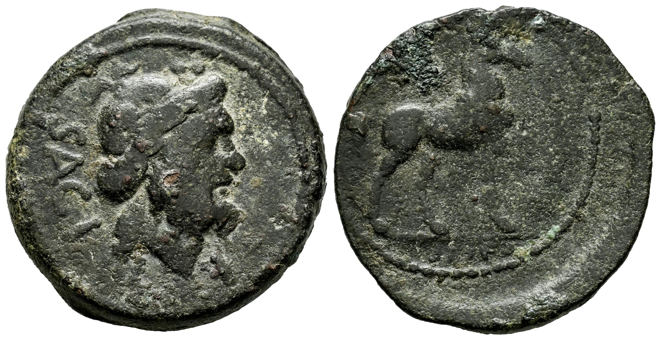 Sacili. As. 120-50 a.C. Pedro Abad (Córdoba). (Abh-2019). (MIB-27/1). (Acip-954). Anv.: Cabeza barbada a derecha, detrás SACILI. Rev.: Caballo al paso a derecha, debajo leyenda neo-púnica. Ae. 23,56 g. Rara con la leyenda del reverso completa y tan nítida. MBC-. Est...180,00.