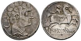 Sekobirikes. Denario. 120-30 a.C. Saelices (Cuenca). (Abh-2172). (Acip-1874). (C-9). Anv.: Cabeza masculina a derecha, detrás creciente y debajo letra ibérica S. Rev.: Jinete con lanza a derecha asomando dos pies, debajo leyenda ibérica SEKOBIRIKES. Ag. 3,05 g. Ligero tono. MBC+. Est...250,00.