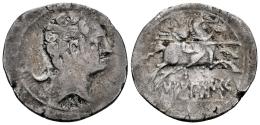 Sekobirikes. Denario. 120-30 a.C. Saelices (Cuenca). (Abh-2172). (Acip-1874). (C-9). Anv.: Cabeza masculina a derecha, detrás creciente y debajo letra ibérica S. Rev.: Jinete con lanza a derecha asomando dos pies, debajo leyenda ibérica SEKOBIRIKES. Ag. 3,26 g. Alabeada. Pátina. MBC-. Est...150,00.