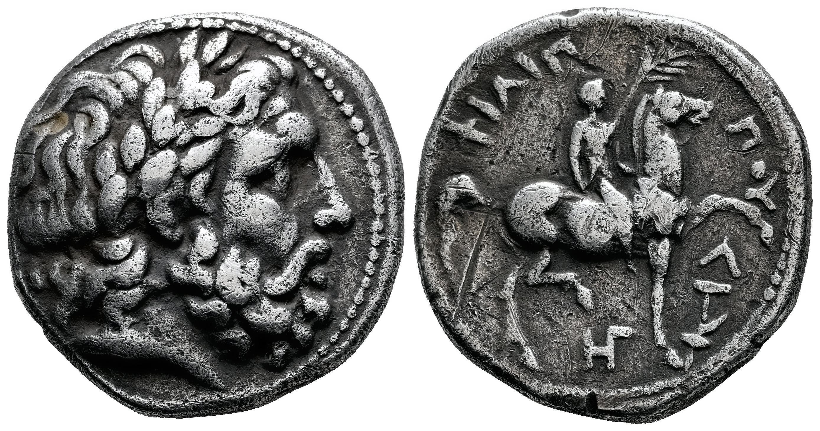 Reino de Macedonia. Filipo II. Tetradracma. 315-294 a.C. Amphipolis. Acuñado por Kassander o su hijo Antipater. (Le Rider-pl. 47, 11). Anv.: Cabeza laureada de Zeus a la derecha. Rev.: Joven a caballo a la derecha, sosteniendo la palma; ΦIΛIΠΠOY alrededor, monograma HΓ debajo del caballo, Λ-T sobre una antorcha debajo de la pata delantera. Ag. 14,00 g. Raya en reverso. MBC/MBC-. Est...300,00.