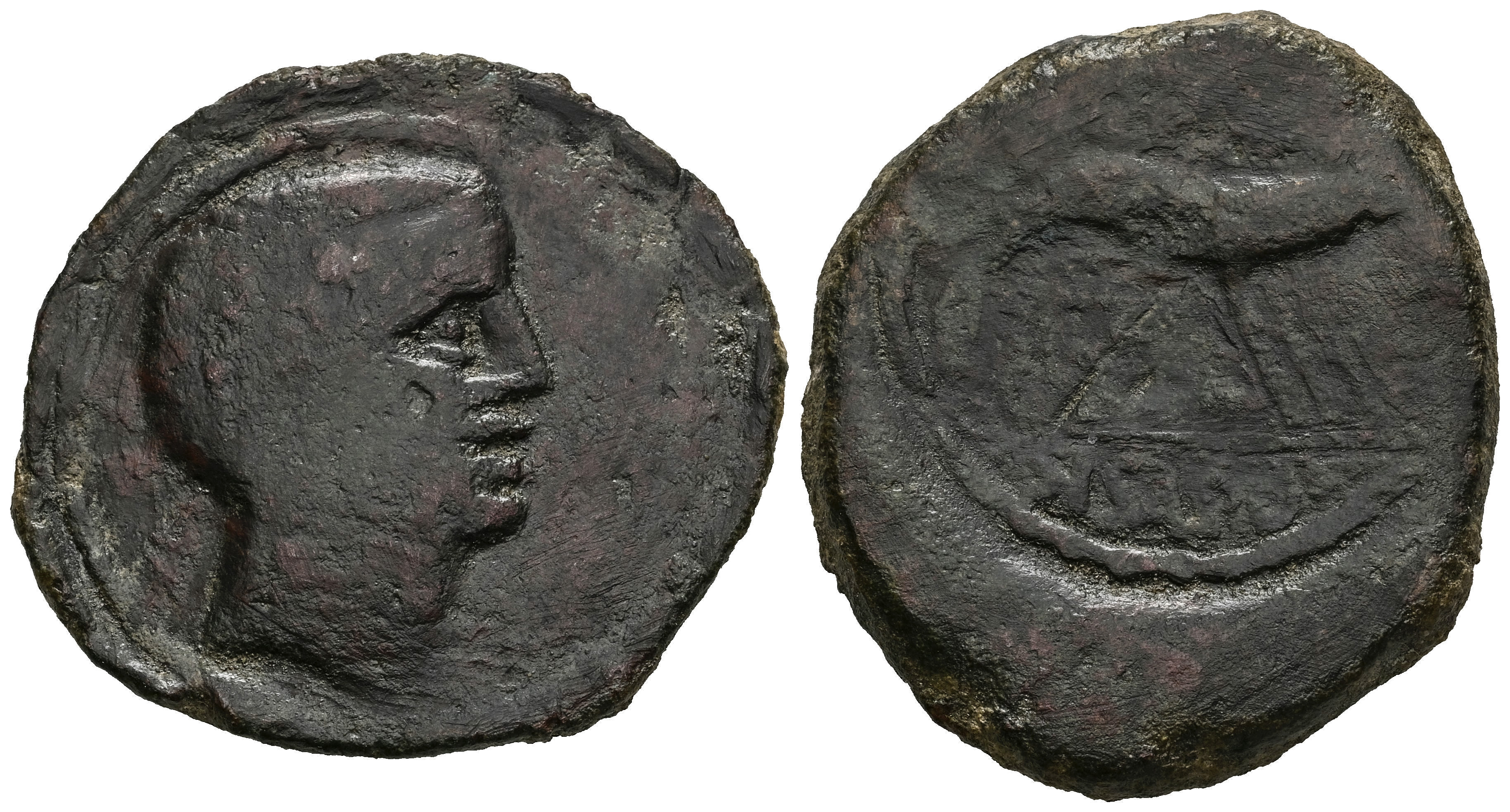 Sisapo. As. 50-20 a.C. Zona de Almadén (Ciudad Real). (Abh-2253). (MIB-213/1). (Acip-2442). Anv.: Cabeza masculina a derecha. Rev.: Jabalí a derecha, debajo SISAPO. Ae. 17,53 g. Muy escasa. BC+. Est...150,00.