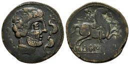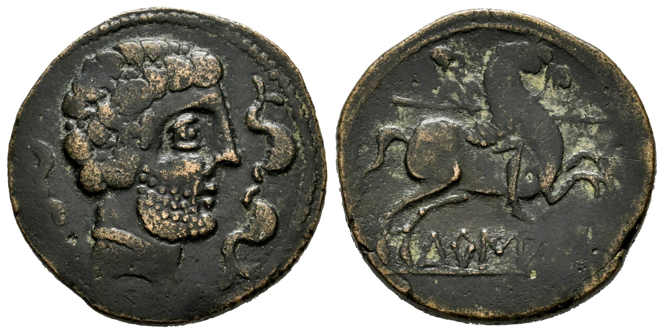 Turiasu. As. 120-20 a.C. Tarazona (Zaragoza). (Abh-No cita). (MIB-109/40 ID 97582, mismo ejemplar). (Acip-1736). Anv.: Cabeza barbada a derecha, rodeada de tres delfines. Rev.: Jinete con lanza a derecha, debajo TURIASU sobre línea. Ae. 9,97 g. Buen pedigree: CORPVS "Nvmmvm Hispaniae Ante Avgvsti Aetatem" nº 26, mismo ejemplar; MIB 109/40 ID 97582, mismo ejemplar. Ex Cayón 53 (27/11/2018), lote 535. MBC. Est...200,00.