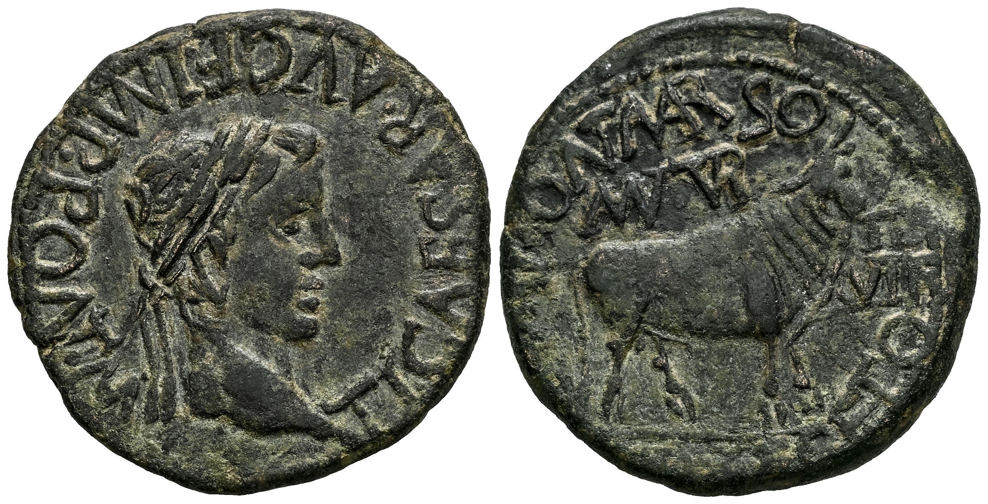 Turiaso. Época de Augusto. As. 27 a.C-14 d.C. Tarazona (Zaragoza). (Abh-2450). (Acip-3291). Anv.: Cabeza laureada de Tiberio a derecha, alrededor TI. CAESAR. AVG F. IMP. PONT. M. Rev.: Toro a derecha, alrededor M. PONT, encima del toro MVN. TVR, VEGETO debajo. Ae. 11,96 g. MBC+/MBC. Est...100,00.