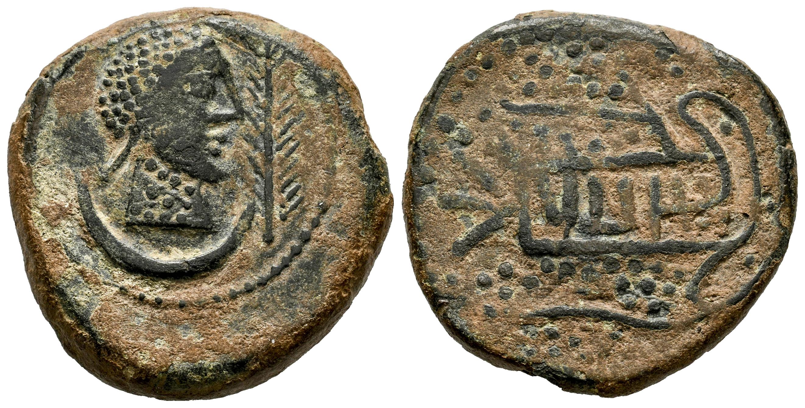 Ulia. As. 50 a.C. Montemayor (Córdoba). (Abh-2493). (MIB-207/2). (Acip-2320). Anv.: Cabeza femenina a derecha, delante espiga, debajo creciente. Rev.: Ramas de vid de trazos más rectos, cartela con leyenda VLIA. Ae. 27,34 g. MBC+/MBC. Est...150,00.