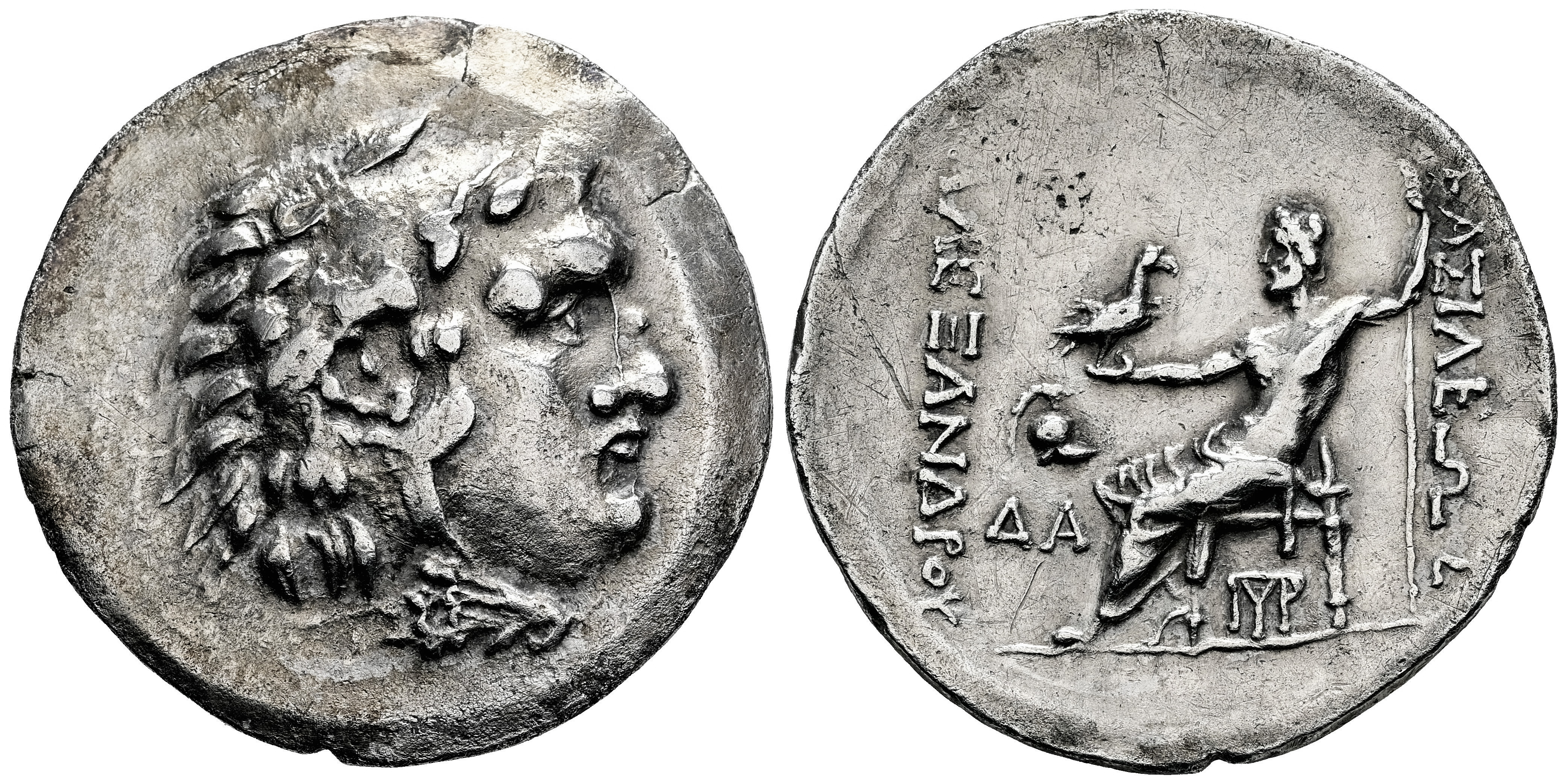 Reino de Macedonia. Alejandro III Magno. Tetradracma. 150-125 a.C. Mesembria. (Price-1066). Anv.: Cabeza de Heracles a derecha, tocado con piel de león. Rev.: Zeus sentado a izquierda, sosteniendo águila en su mano derecha, cetro en su mano izquierda; delante casco corintio sobre ΔA y monograna bajo el trono. Leyendas BAΣIΛEΩΣ AΛEΞANΔPOY a los lados, en posición vertical. Ag. 16,08 g. Acuñación póstuma. Flan grande. Ex Tauler & Fau 73 (19/01/2021), lote 52. MBC+. Est...200,00.