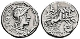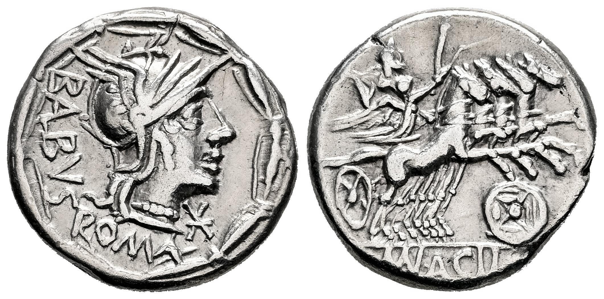 Acilia. Man. Acilius Balbus. Denario. 125 a.C. Roma. (Ffc-92). (Craw-271/1). (Cal-64). Anv.: Cabeza de Roma a derecha, delante: X,detrás: BALBVS ROMA, (AL entrelazadas), todo dentro de una corona. Rev.: Júpiter con cetro y látigo en cuadriga a derecha conducida por la Victoria, debajo: escudo macedonio,en el exergo: MN. ACILI. (MN entrelazadas). Ag. 3,92 g. Ex Áureo & Calicó 394 (14/09/2022), lote 1030. MBC+. Est...140,00.