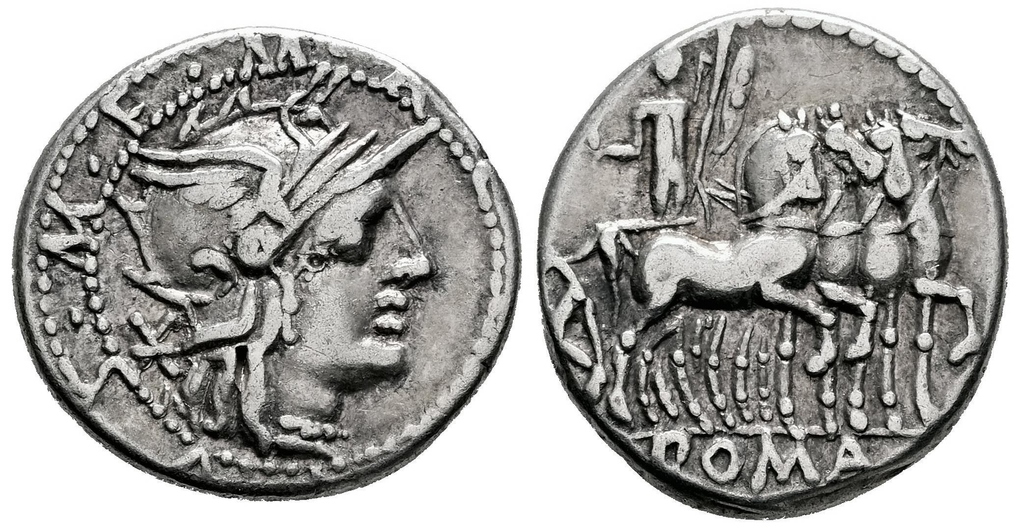 Acilia. Marcus Acilius Marci f. Denario. 130 a.C. Roma. (Ffc-93). (Craw-255/1). (Cal-65). Anv.: Cabeza de Roma a derecha detrás: X, Ley./ entre collar y gráfila de puntos: M. A(CILI)VS M.F. Rev.: Hercules con trofeo y maza, en cuadriga al paso a derecha,en el exergo: ROMA. Ag. 3,86 g. MBC-. Est...70,00.